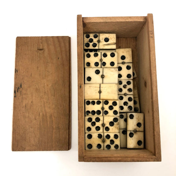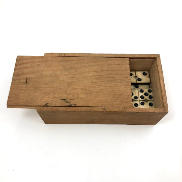 Dominoes measure 1 5/8" x 3/4" x 1/4". Box is 6 1/8" l x 3 1/4" w x 2 1/4" t. Wear,  a few hairline cracks in the bone, and plenty of irregularity to the dominoes as pictured, but no significant damage to any of them and I sure think they are lovely.