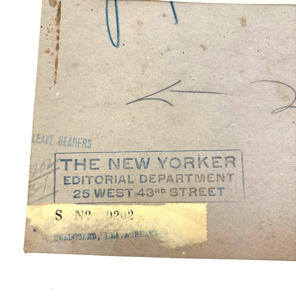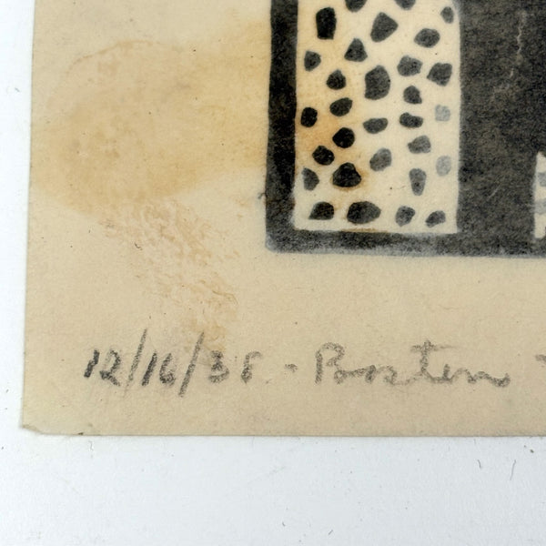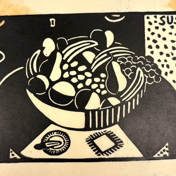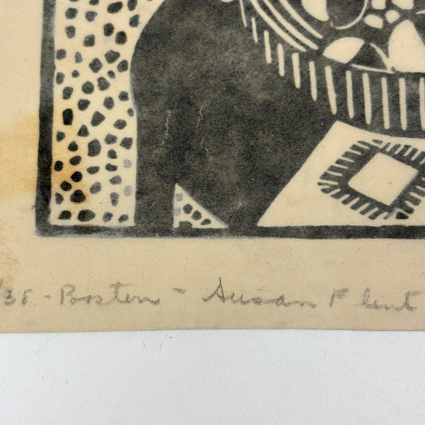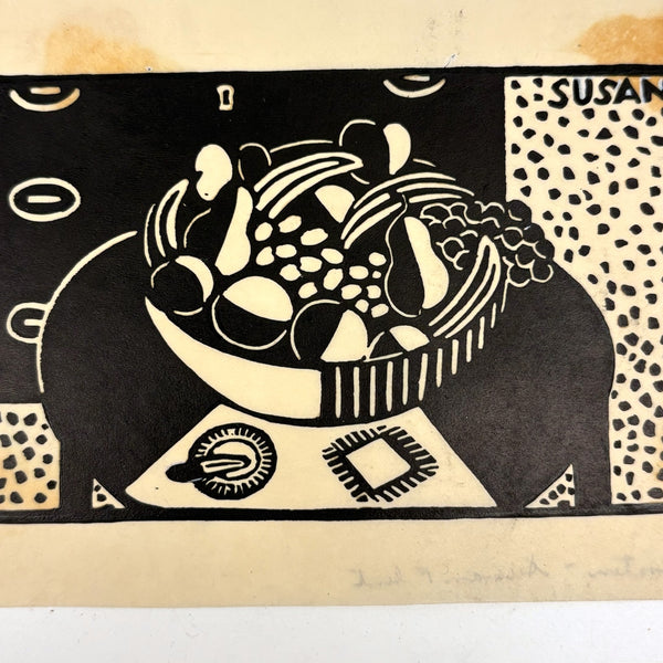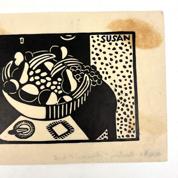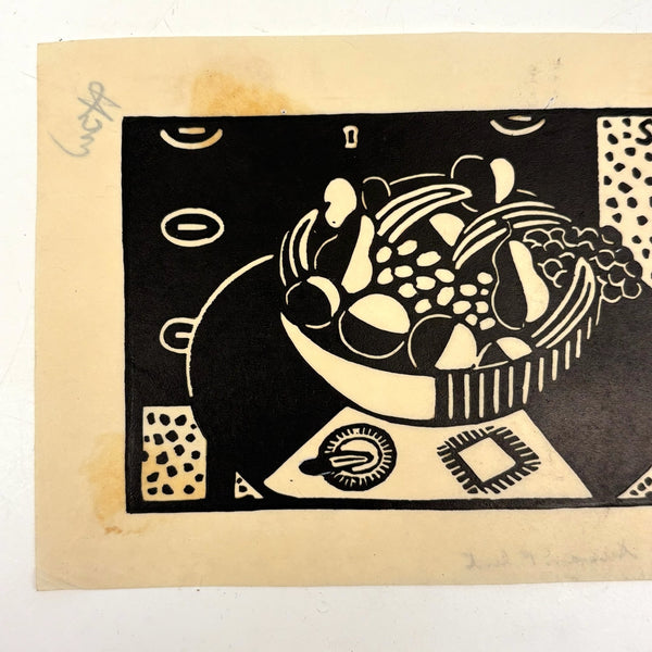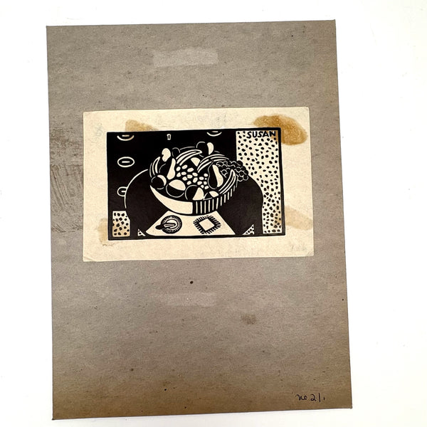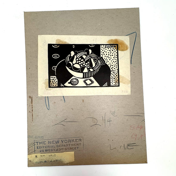 Susan Willard Flint (American, 1902-1984) was best known for her “spots” as published in the New Yorker--of which this bowl of fruit on table black ink linocut is an example, signed and dated 1938 and found still adhered to a sheet of cardboard stamped by The New Yorker Editorial Department. Feels SO classic New Yorker to me, and indeed Flint's illustrations like this one, contributed just a decade into the publication's run, helped to define the look. Yes, there is some old rubber glue stain showing through the paper here, but for me those are very romantic stains, having carried it through Harold Ross's editorial offices!