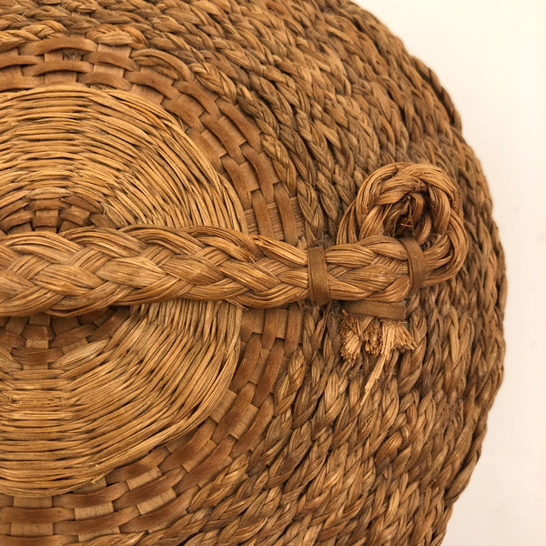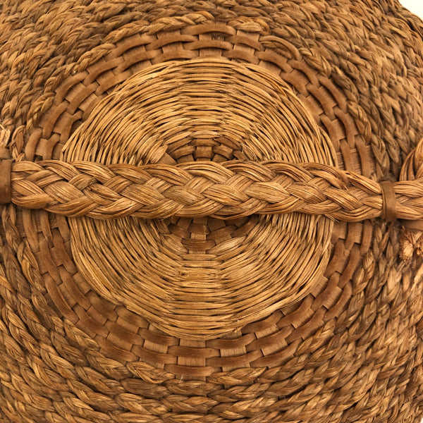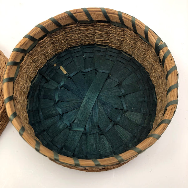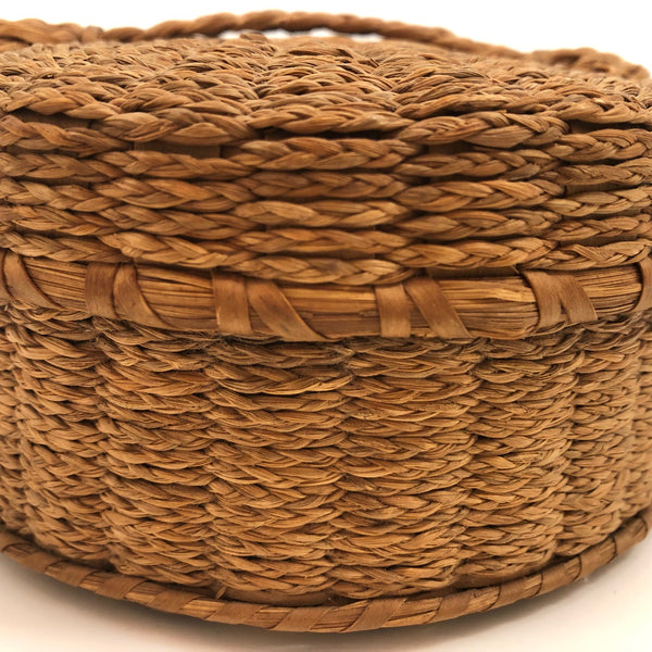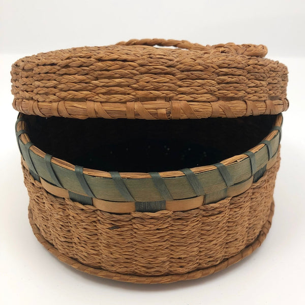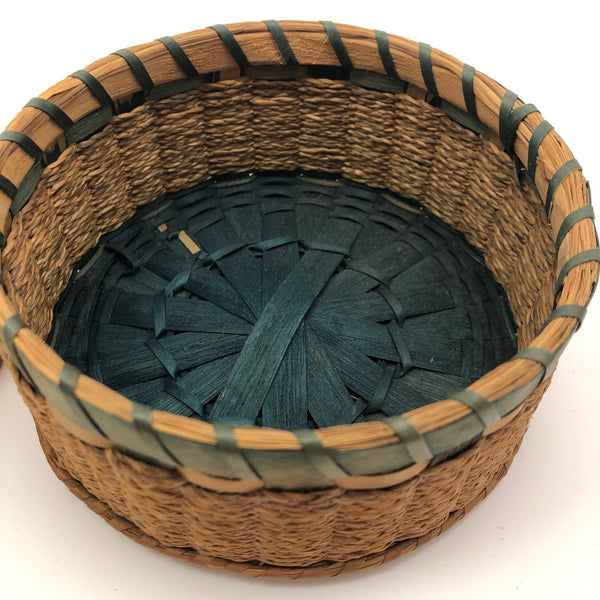 This is a lovely, quintessential example of Penobscot basketry, featuring a wonderful interplay of patterns and textures. The lid is woven primarily with tight sweetgrass braids, punctuated with two bands of woven ash splint nearer to the center framing one band of unbraided grass, then a nice fat braid across the top for a handle. With lid removed, the bottom half reveals a rim of blue-green naturally dyed ash splint, also visible at the center of the underside of the lid and on the bottom of the basket.