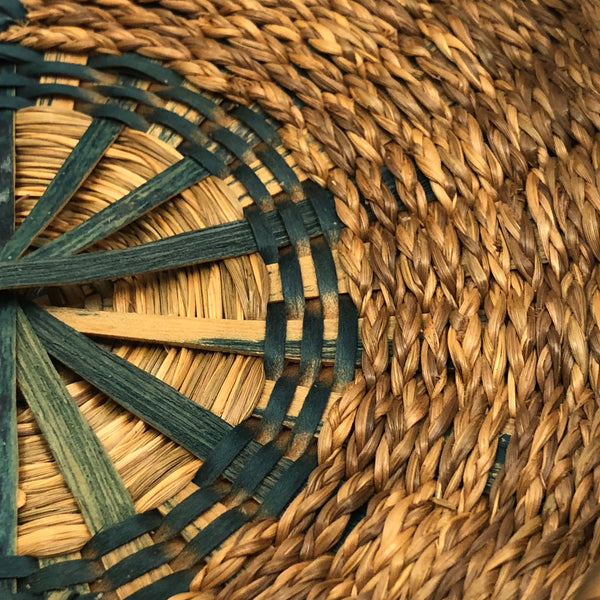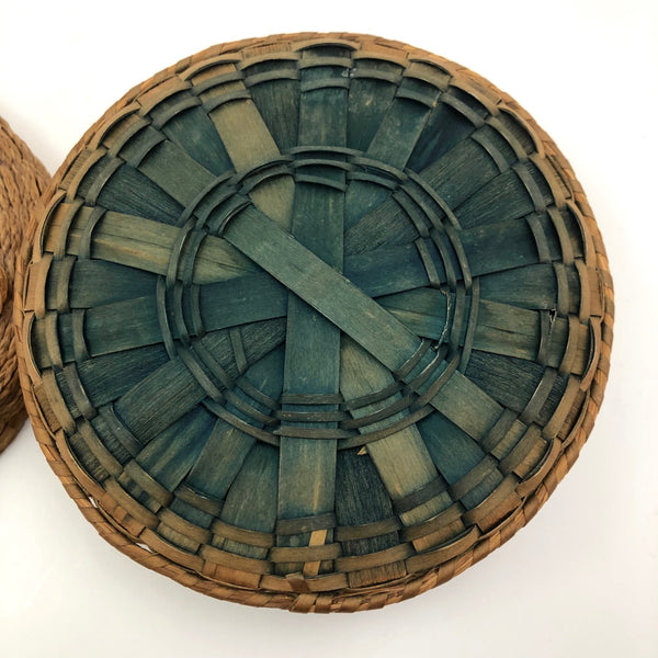 I'd guess this basket dates to the first half of the 20th century, and remains in excellent condition, with just some fading to the color on the underside of the bottom. 5 1/2" in diameter and 2 7/8" tall.