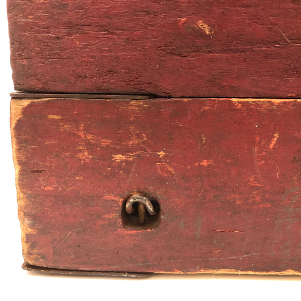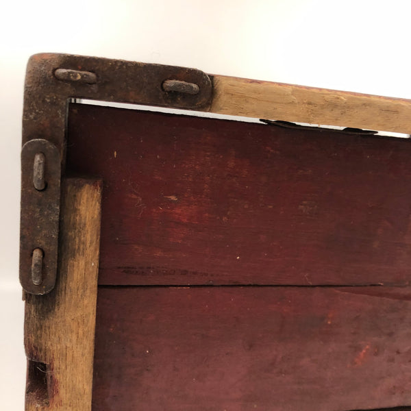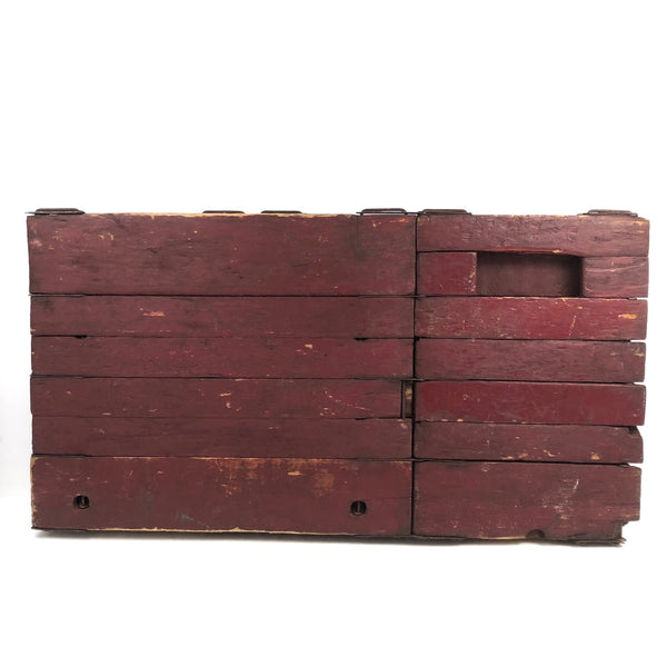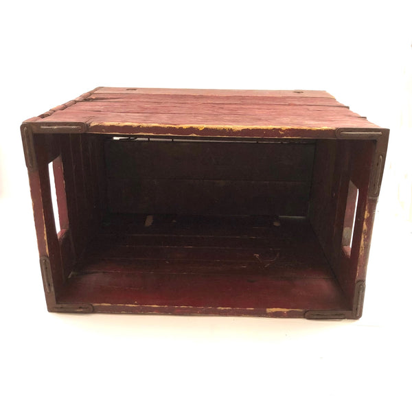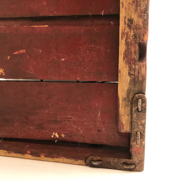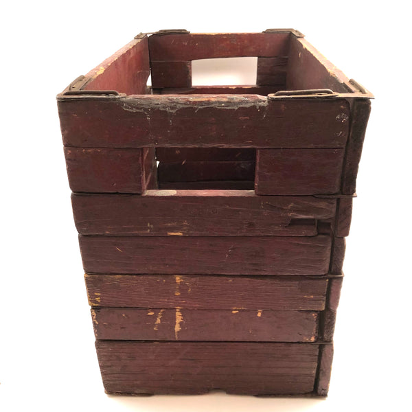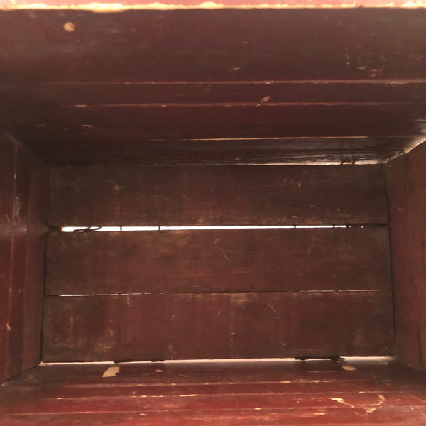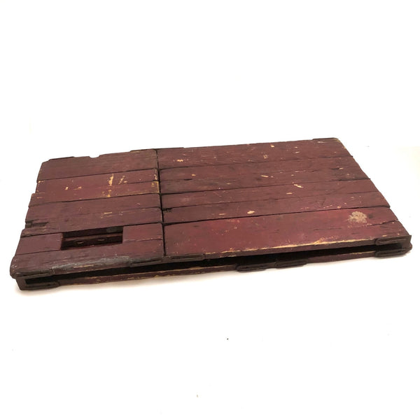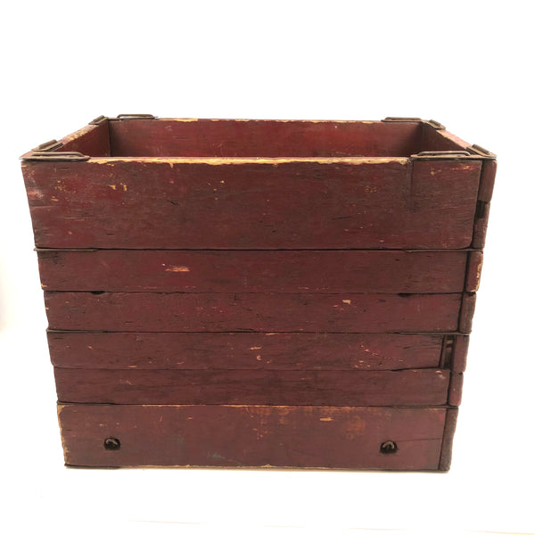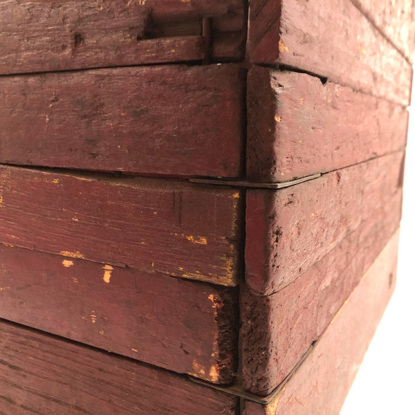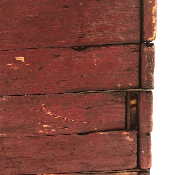 I love this thing--and as I am often loading up the car with fragile things, it strikes me as an especially handy one, too, folding up flat and so taking up no space when not needed. Plus this terrific old dark red paint, which makes it feel a bit like a red brick wall when collapsed! Terrific patina, very sturdy, easy to open and then to collapse. A good one for housing a huge stash of wooden blocks, or some firewood, or the laundry! Nice.