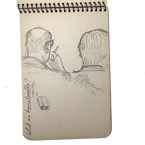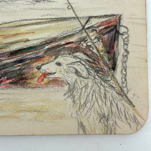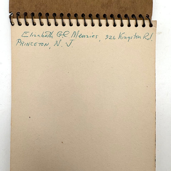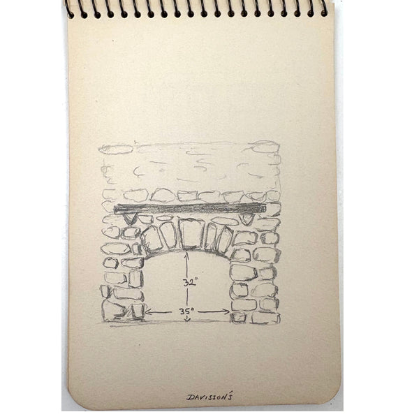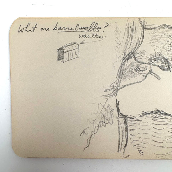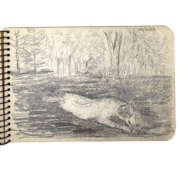 Seems to me the person who kept this little notebook was planning or in the process of building a cabin in the woods, with several pages devoted to details of construction - the laying of the logs, front door (I really like that drawing just as a drawing), windows, fireplace, etc. but then there are also sketches of the environs and, I presume, the family dog. All drawings documented.
