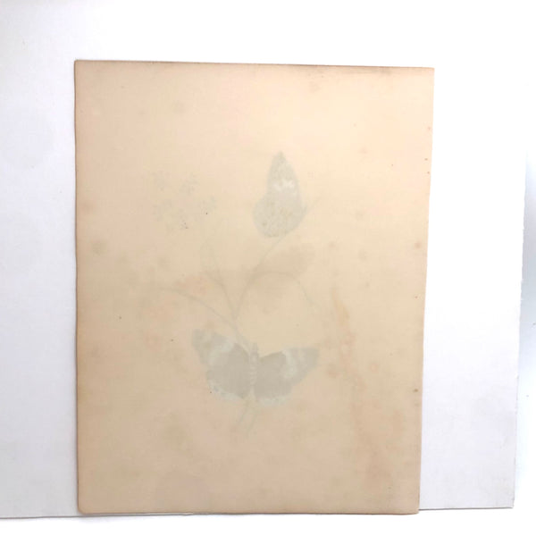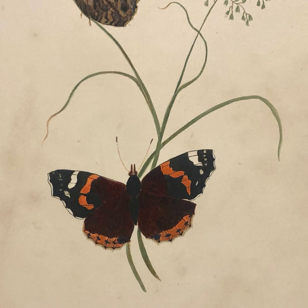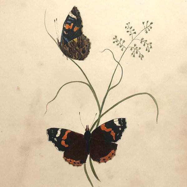 A few last 19th century ink and watercolor butterfly drawings today from a portfolio of half a dozen or so I purchased from a favorite dealer in the Hudson River Valley several weeks ago. This beautiful pair are identified at lower left as Red Admirals, and I must say the wings on them, especially the camouflage mottling of the lower wing of the one at top, make me swoon (see detail photos!) Such wondrous creatures, which this watercolor does a lovely job of capturing.