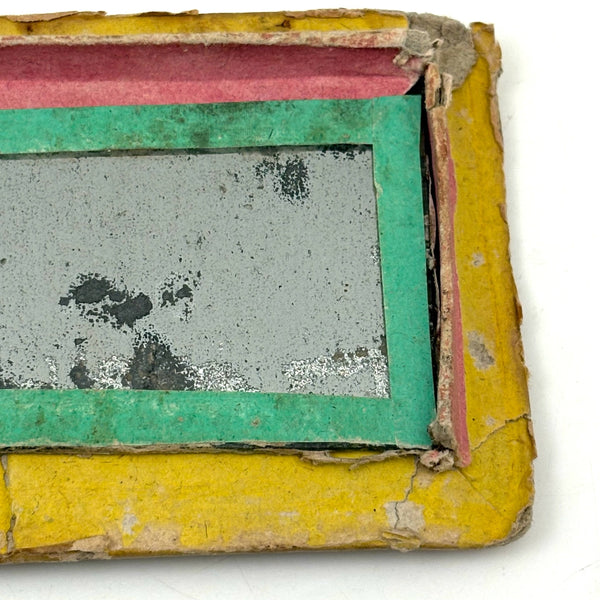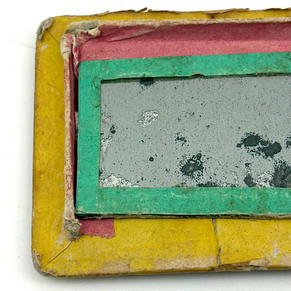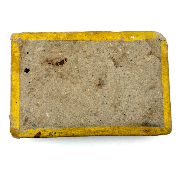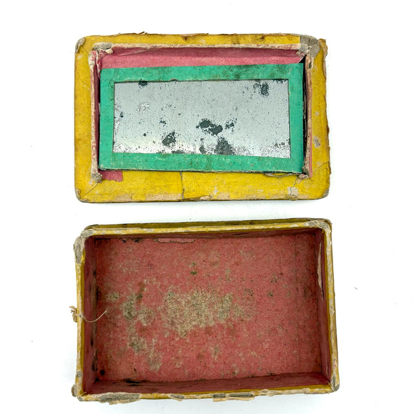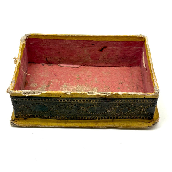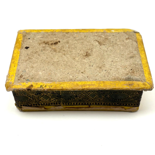 4 1/4" x 2 7/8" x 1 1/2" t. General wear as documented--mostly bumping to the corners and wear along the edges of the cardboard. Only very minor loss to the yellow and embossed gold paper. Sound and not fragile, lid fits atop the box just as it should and lies flush.