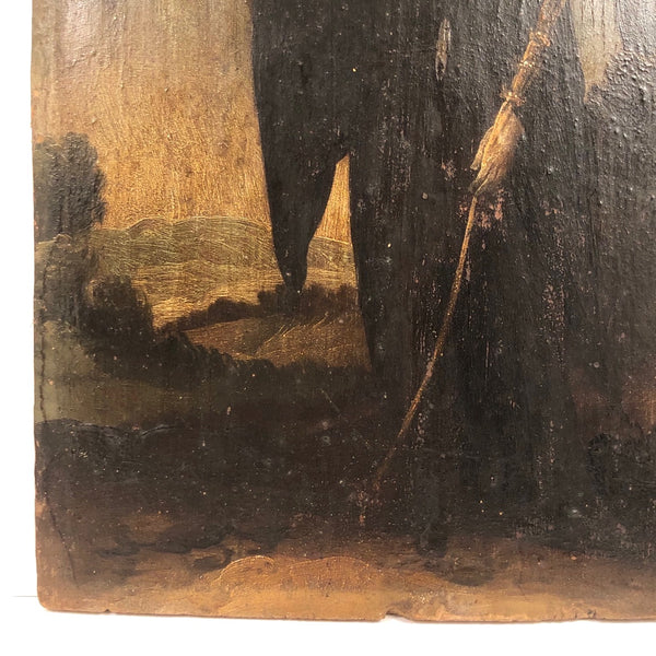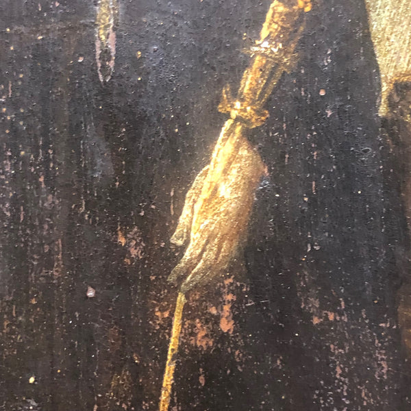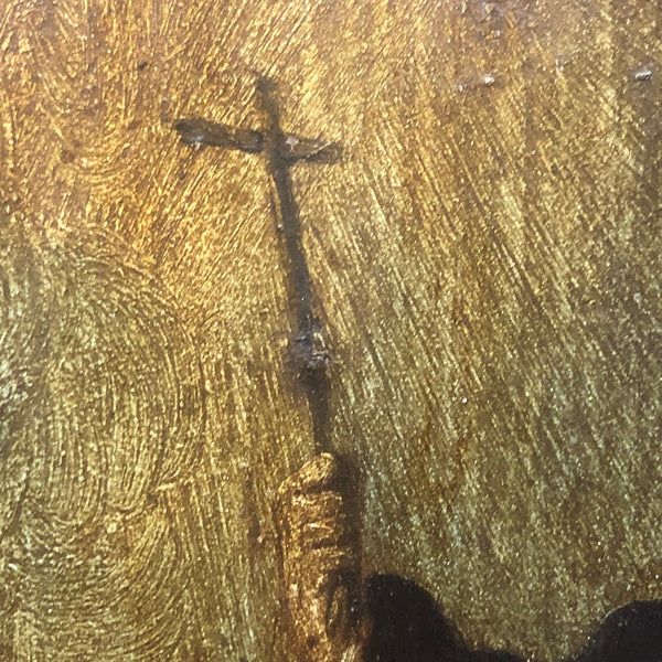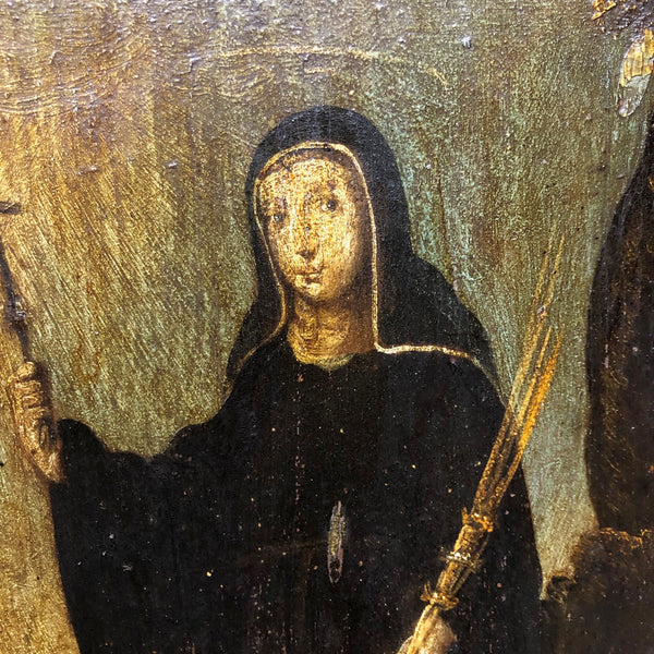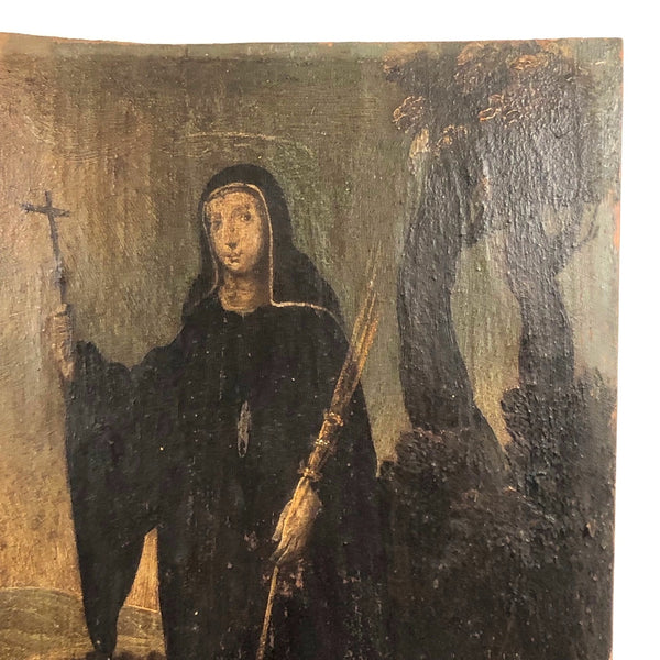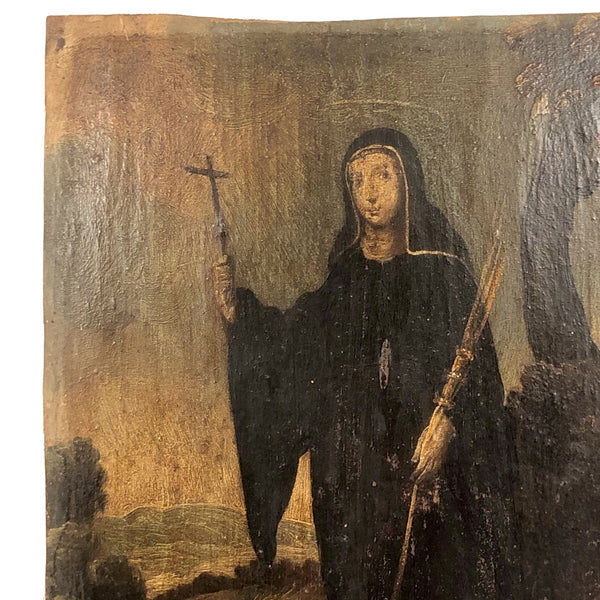 I purchased this painting from a seller in Spain, who consistently has wonderful things--18th century Spanish I believe, oil on wood, framed as found. The subject is Santa Rita (born Margherita Ferri Lotti; 1381- May, 22 1457), Italian widow and Augustinian nun, known as a saint of lost and impossible causes, and marital problems, having endured and apparently has some success in converting a very abusive husband into a better person. She is often portrayed with a bleeding wound on her forehead--evident here upon close inspection, which is understood to indicate a partial stigmata--as well as holding a large cross and a flagellum whip, both as here, the latter a symbol of her mortification of the flash.