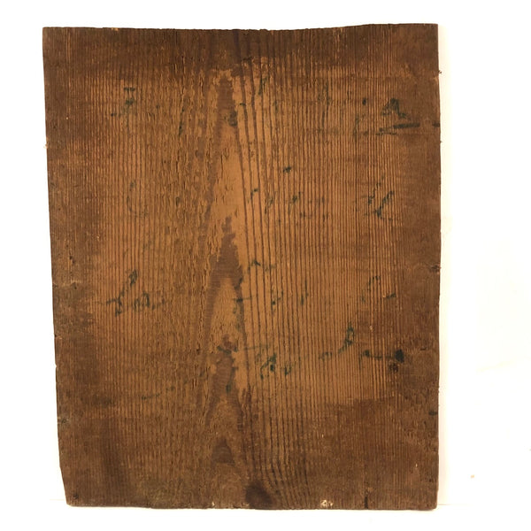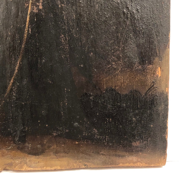 This painting is dark and moody and very mystical feeling (and difficult to photograph well); it is of the sort one would very much like to see lit by candlelight, flames illuminating it from below. (A sunbeam hitting her face would also be nice!) I removed it from the frame, where it has clearly lived a long time, to examine it more closely-one can see the painting is somewhat lighter around the edges where it was protected by the frame, and so, if desired, it would clearly brighten with cleaning. I would just leave her as is myself, but I like dark and full of aura!