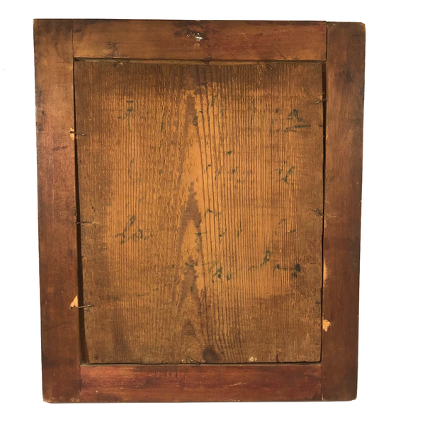 20 13/16" x 15 1/4" framed. Painting itself on wood panel measures 11 7/8" x 9 1/2". Could be cleaned as noted, but otherwise in good condition with no evident paint loss at all.