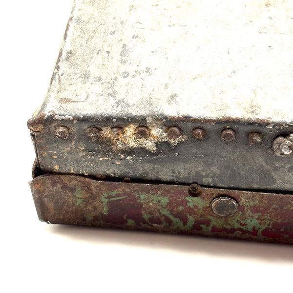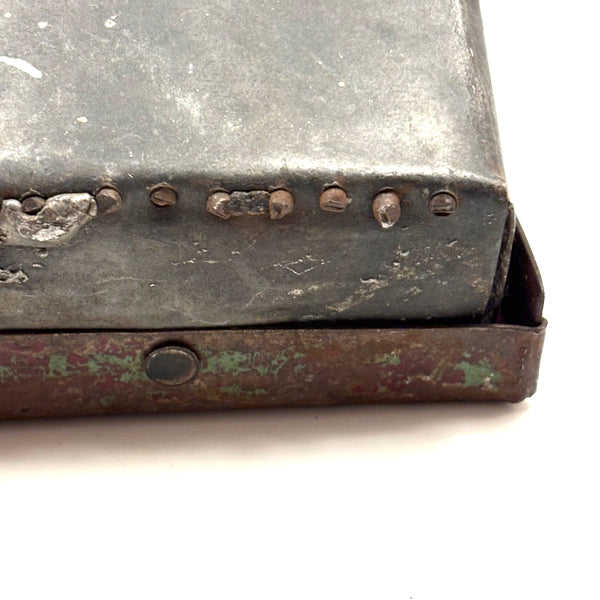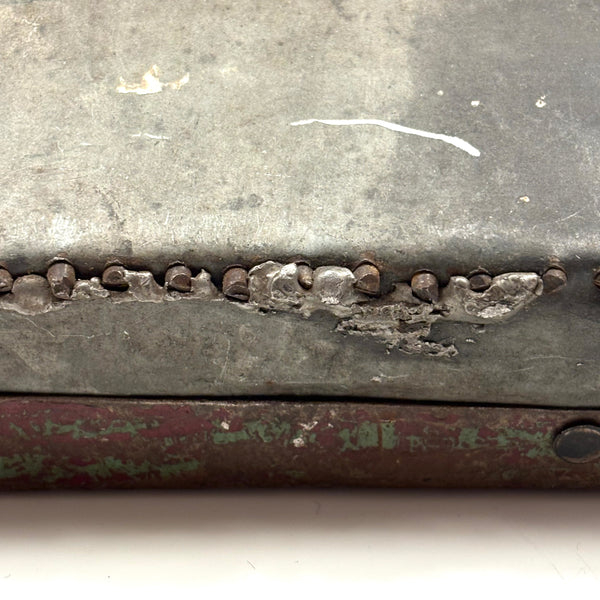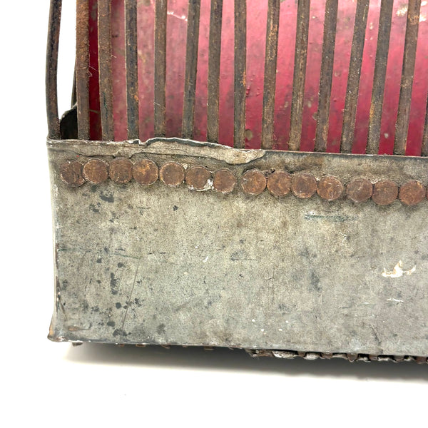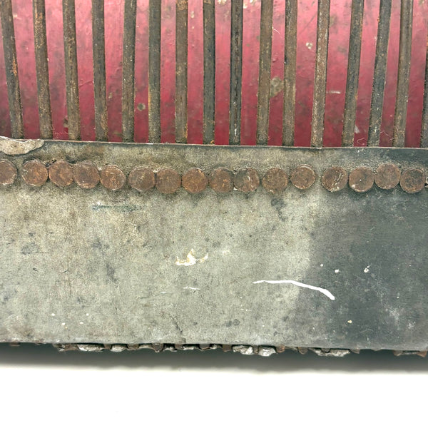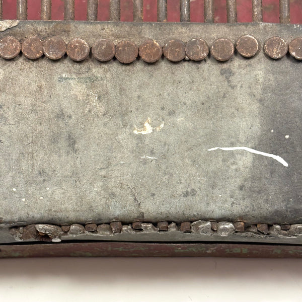 Found in Maine, as might be expected, this is an old "make do" cranberry rake, fashioned of a metal dustpan and two rows of nails, c. 1930s. I really love the horizontal line of nail heads along the front edge, and of course their spikes coming up! The second row of nails/spikes  comes up from the bottom on the interior. A rake like this (though this is very much one of a kind!) would be used for combing cranberries from vines to harvest.