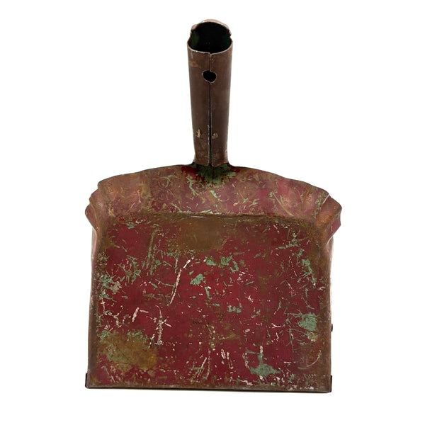 8 5/8" w x 13" t x 2 3/4" d at scoop. Well used condition, and I imagine the dustpan, showing red over green paint, had already lived a life before being put use to make this!