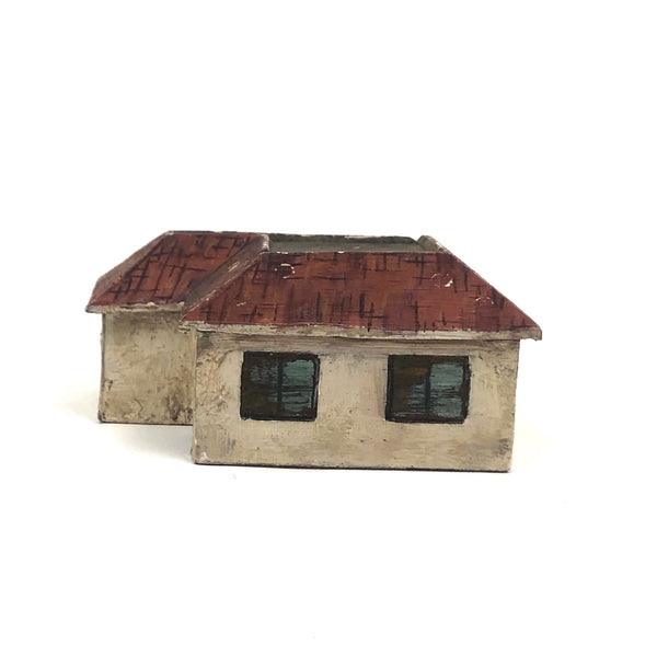The third of three folk art houses by the same maker found this week in Rockland Maine--perhaps made for a model train set up (and if so it must have been quite a thing) or perhaps its maker was a lover of architecture and committed to building an inventory of model houses representing a spectrum of housing styles! I take this one for a mission style bungalow of sorts, with plaster walls and tiled roof. Again, wonderfully done.