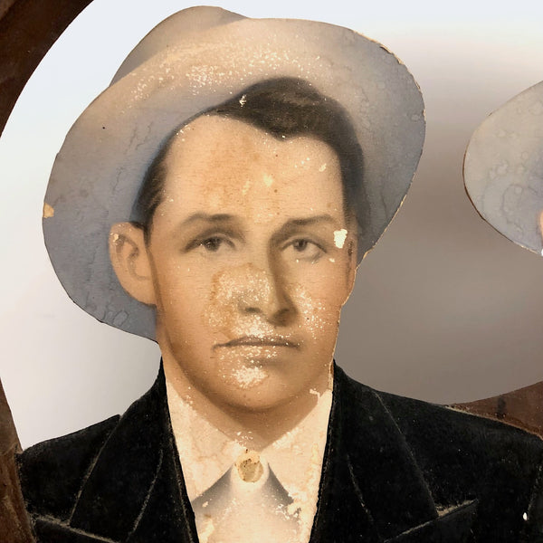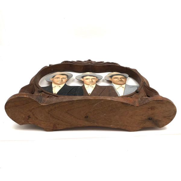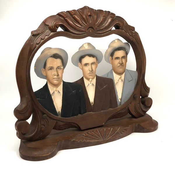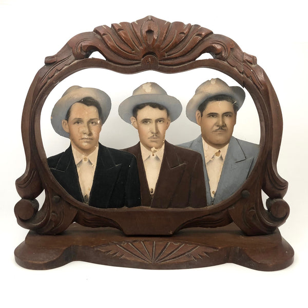 15 1/8" w x 12 9/16" t x approx 4" d. Some surface staining/wear to the face of the man at left and to the very tops of the hats at center and right, and I believe likely the loss of fabric or paper ties once adhered to the front of each of their shirts. Otherwise good condition, with quite a marvelous presence. There once would have been a pane of glass behind them, with a couple of brass tacks that would have held it in place, still attached to the back of the frame.