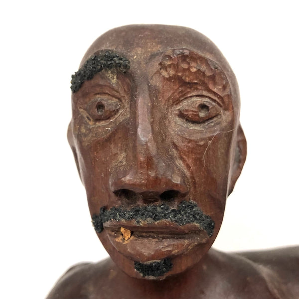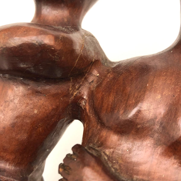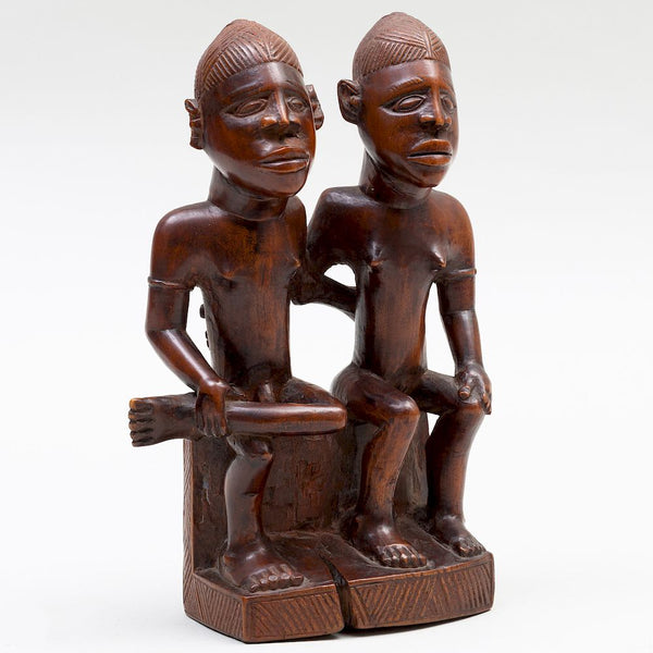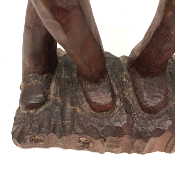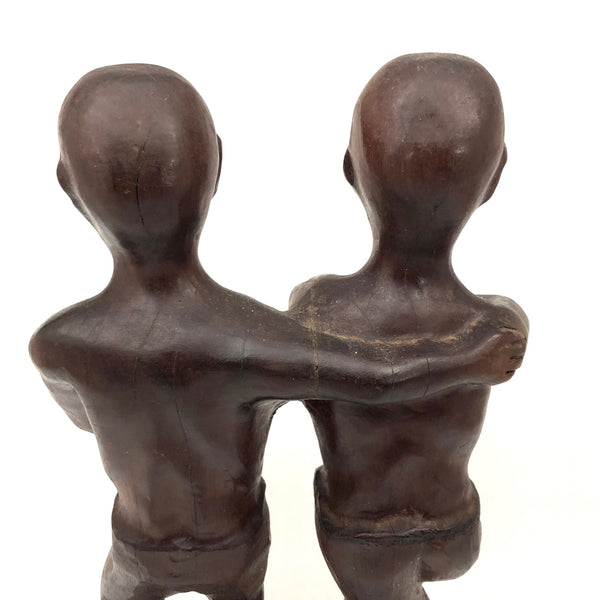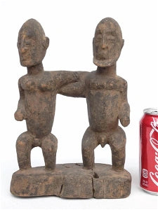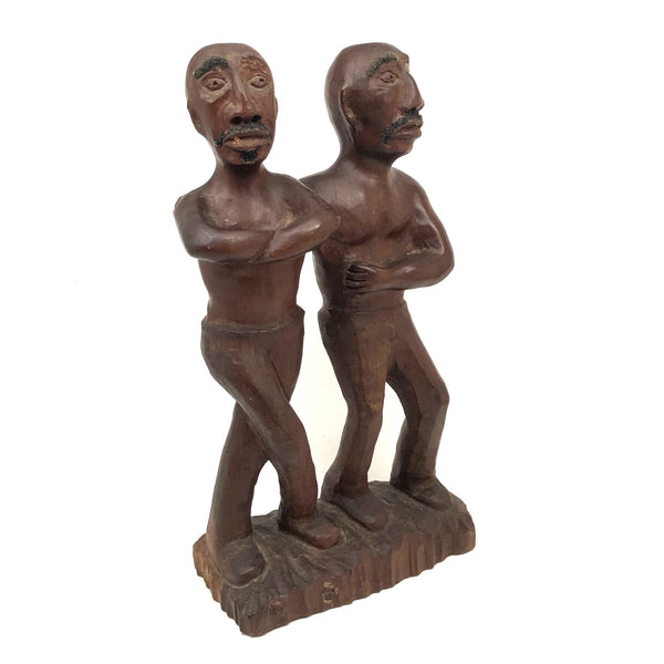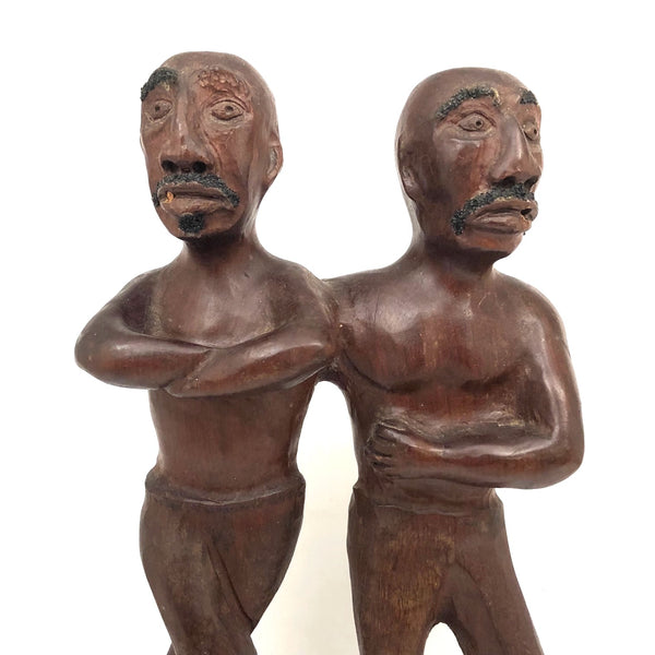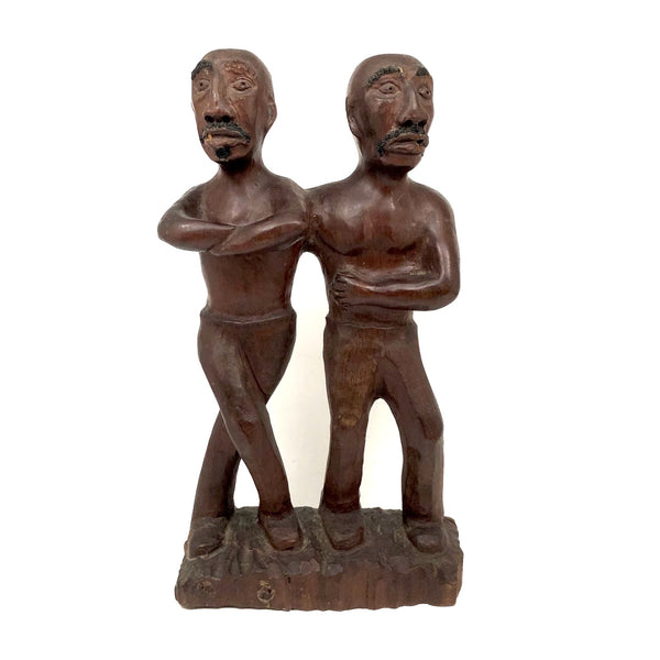 This one came from the estate of an artist, activist, teacher, and friend in my neck of the woods, from whose collections I've listed a bunch of things over the past numbers of weeks. She and her husband travelled frequently to Latin America, especially to Cuba, Haiti, and Mexico, and I believe this piece is likely Haitian. (Seems to me a strong connection between the pairing and postures of these two, side by side joined by one arm wrapped around the other's back, and African tribal carvings of twin and coupled figures--a couple of examples included at end in photos.) Wonderfully carved, with these two holding in their expressive, watchful faces and bare chested bodies some combination of tension and ease, strength and vulnerability, and a certain self-protectiveness, individual and shared. A fair bit of attitude, too, which would be enhanced a bit more I think by replacing the toothpick that has gone missing from the mouth of the man at right! With a strong presence. and terrific from the back as well as the front.