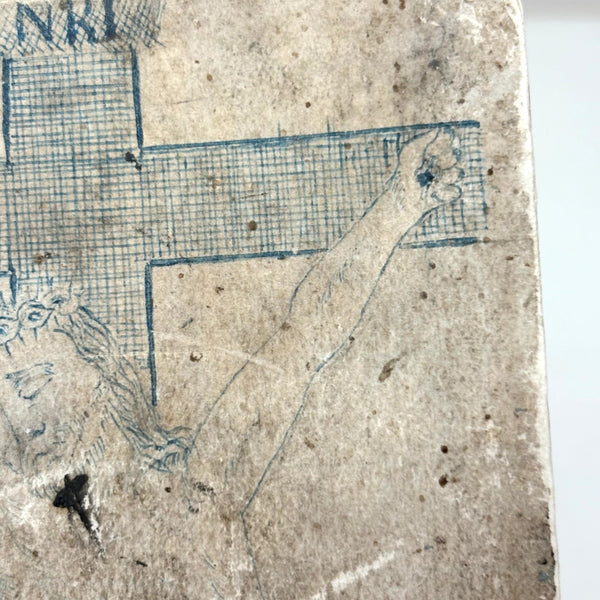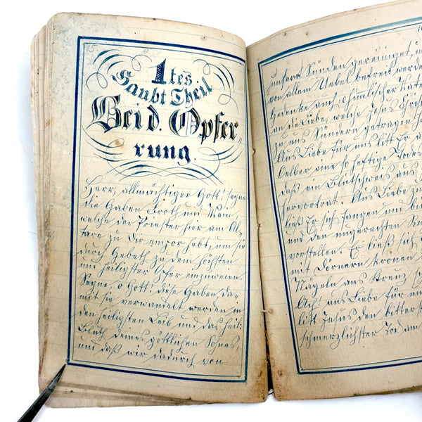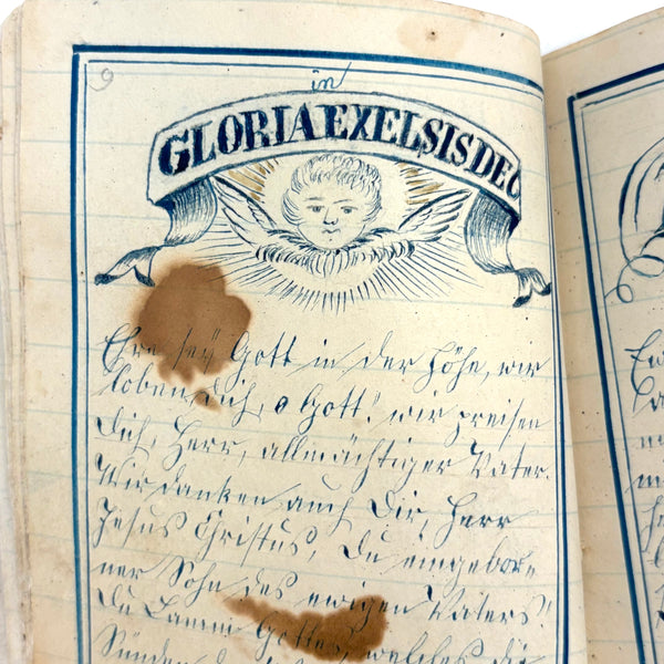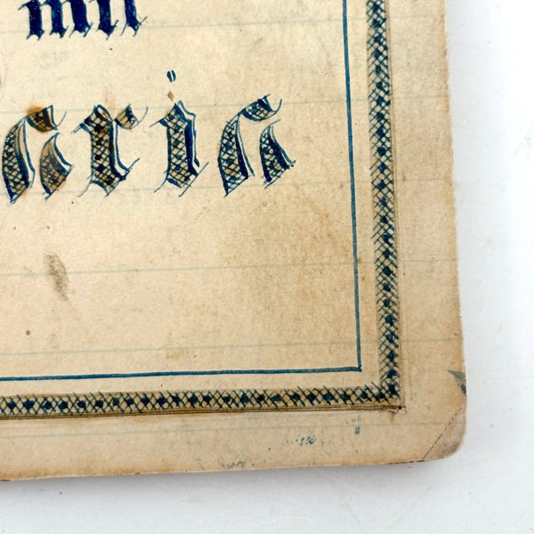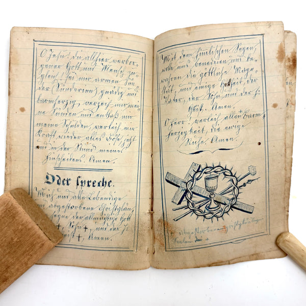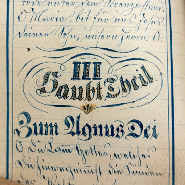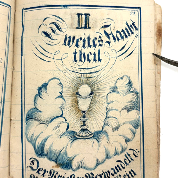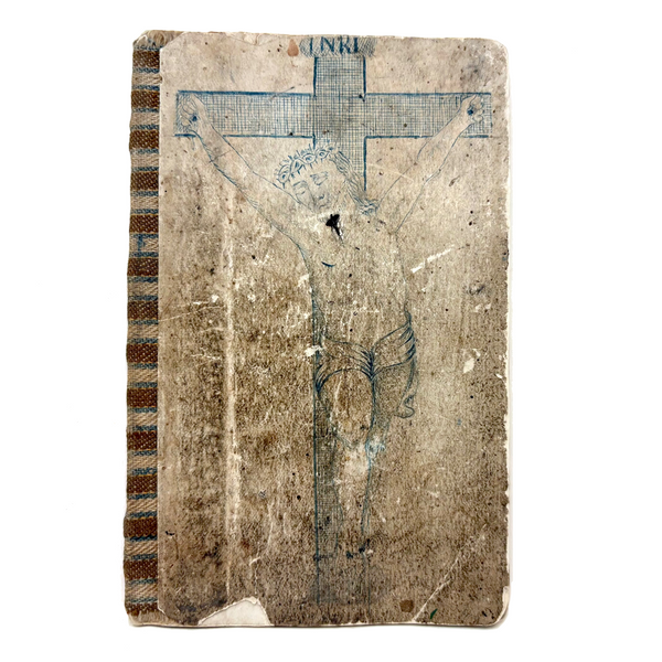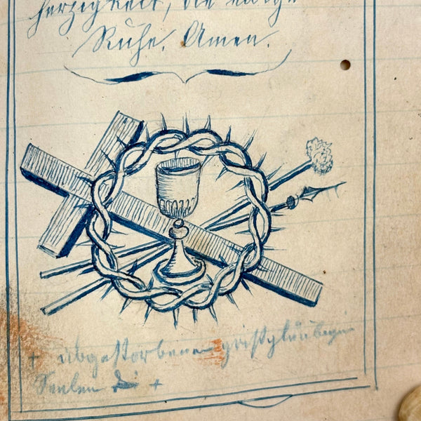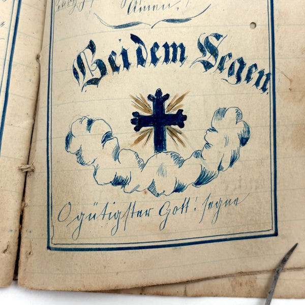 Photos give a good sense--not every page documented, but most of those with drawings or beautifully lettered headers, all executed in strong blue ink, with sepia details here and there (reading as golden beams of light!), and carefully inked borders on every page. And the most beautiful drawing of all the one on the cover I think, as sensitive and evocative portrayal of Jesus crucified on the cross in crown of thorns as could be--and with the wear to the cover making him seem all the more like an ethereal vision! Nice cloth wrap to the spine, too. Quite a thing.