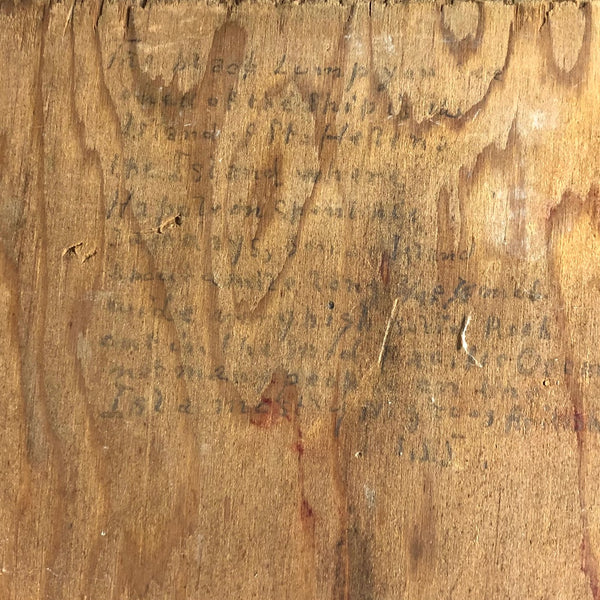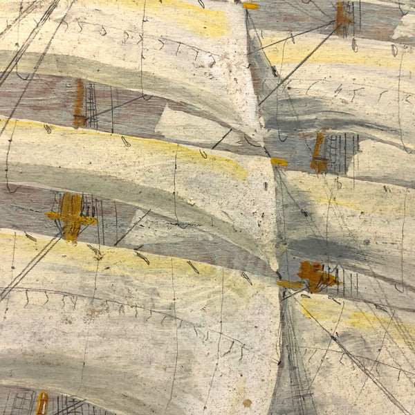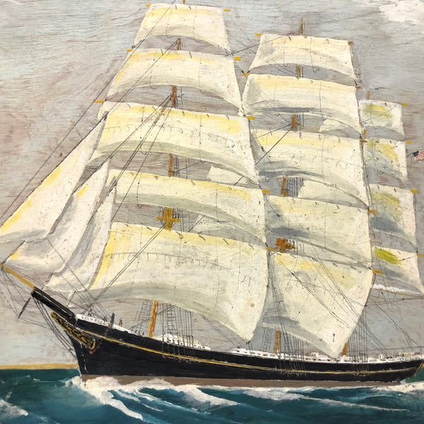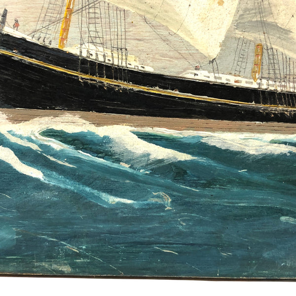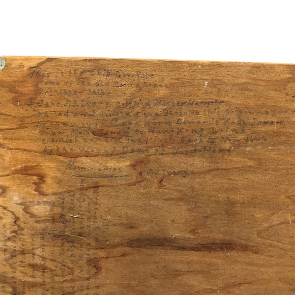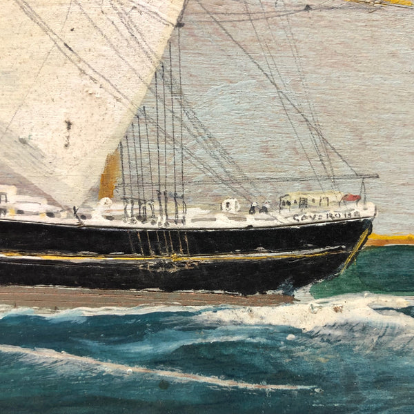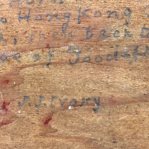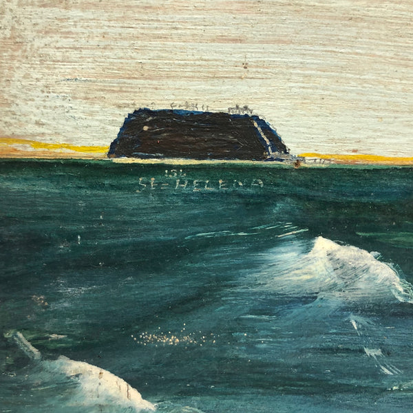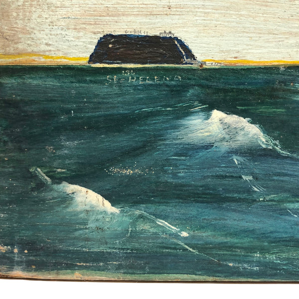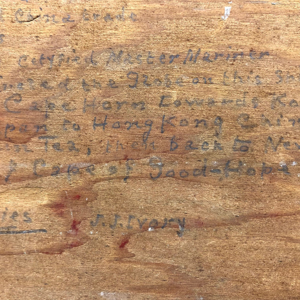 This one, painted on plywood, is a terrific example, depicting the grand Governor Robie, a clipper ship (built in Bath, Maine) named after Frederick Robie, (governor of Maine from 1883 to 1887.) The Governor Robie was among the last of the sailing ships in the China trade, and on the reverse of the painting Ivory  describes having sailed on it in 1892 to Hong Kong by way of Cape Horn, returning to New York by way of the Cape of Good Hope, with his text ending in “memories…JJ Ivory.” This seems both a quintessential and a prime example of his work, including for the (albeit a bit challenging to decipher) personal text on reverse, which includes a description of “the black lump” which is the volcanic St. Helena island, a favorite stopping place (1200 miles off the coast of Angola) for Vineyard whalers in the 19th century.
