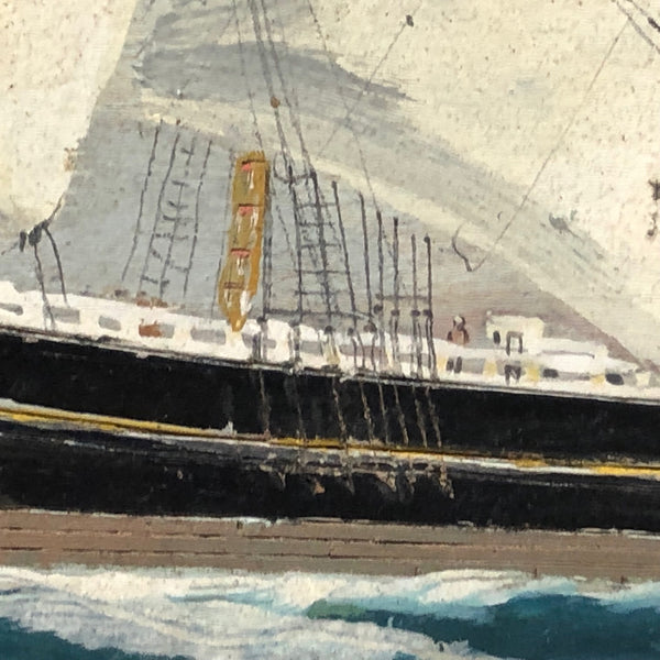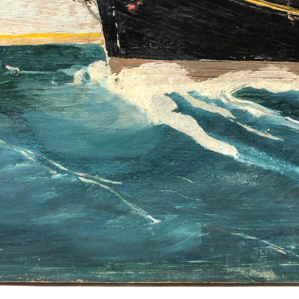 I purchased this and a second painting (of the SS Martha’s Vineyard) at an auction in New Hampshire, not knowing much about the late Capt. John J. Ivory who painted them, but just thinking they were great folk art ship paintings. The blue of that water gets me every time, and of course I love the tiny people! I’ve done some research since (and there is a bunch of text handwritten by Ivory on the back of this one, too),  learning that Captain Ivory was quite a fixture and legend on Martha’s Vineyard, known for his seafaring tales (and his drinking!) as well as for his paintings, a number of which are held in the collections of the Vineyard Haven Library and Martha’s Vineyard Museum.  [More about Ivory below]