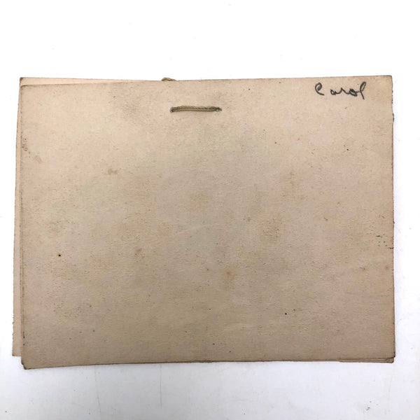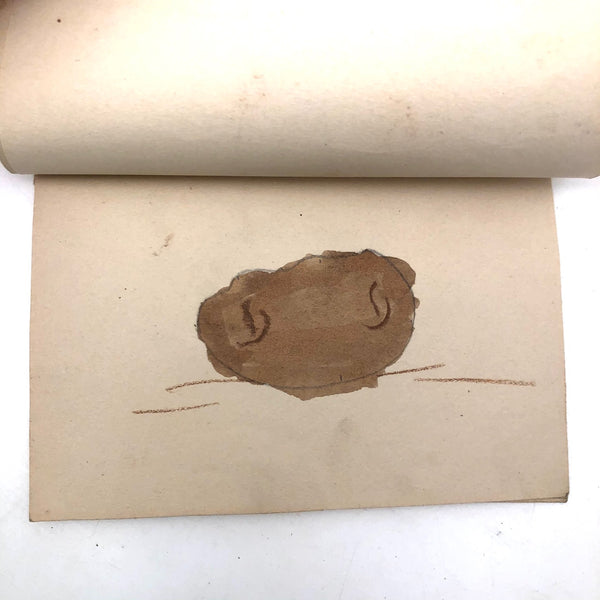 5 3/4" x 4 3/8". Pages are held together with greenish thread pulled through two small holes in the paper and tied in a bow. Cover shows a little staining/pencil smudging to the paper along the top, but overall terrific condition, inside pages super clean and bright, and all easily disassembled if desired to frame.
