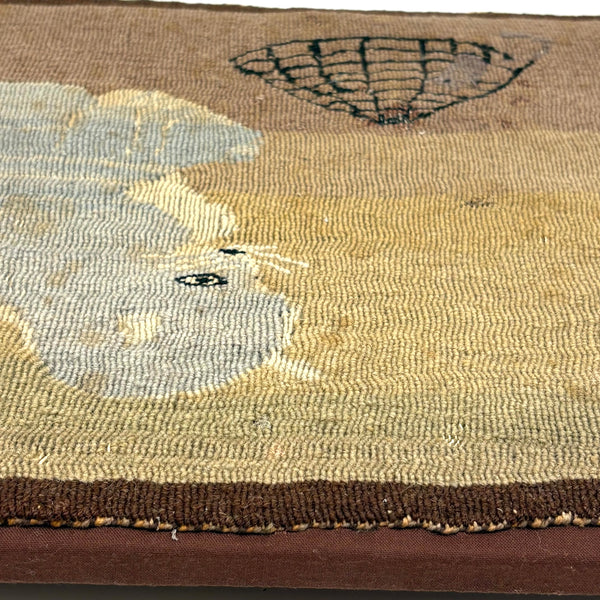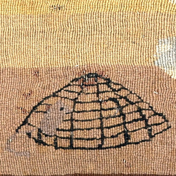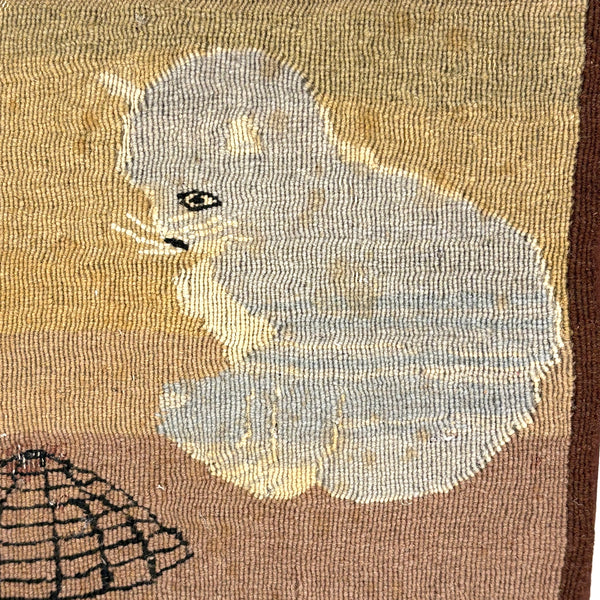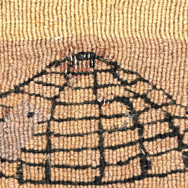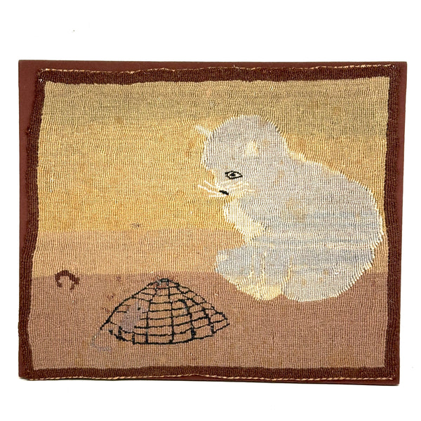 The soft palette on this hand-dyed wood needlepoint/tapestry really does it for me, reminding me a lot of early Grenfell Mission hooked rugs--but of course it is the cat and mouse and cage that charmed the socks of me! A bit hard to tell whether that mouse is trapped in the cage or climbing up the side as if on a jungle gym, which makes me glad! (The cat though certainly looks to me to have a sort of quietly, keenly watching while waiting to pounce disposition.) What that small curl of dark brown to the left of the cage is meant to be, I'm really not sure! To my eye a very charming thing, the manner of which makes me think early 20th century, but perhaps it is older than that.