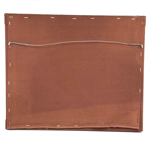 14 7/8" x 12 1/8" as mounted - stitched to fabric and pulled over a wooden stretcher, stapled on reverse. It should not be hard to pull the stitches attaching it to the fabric if desired.