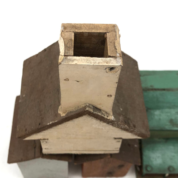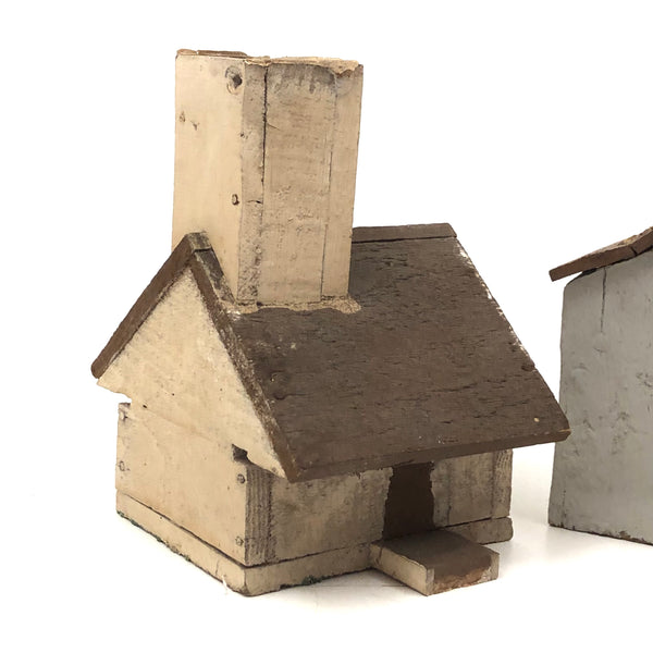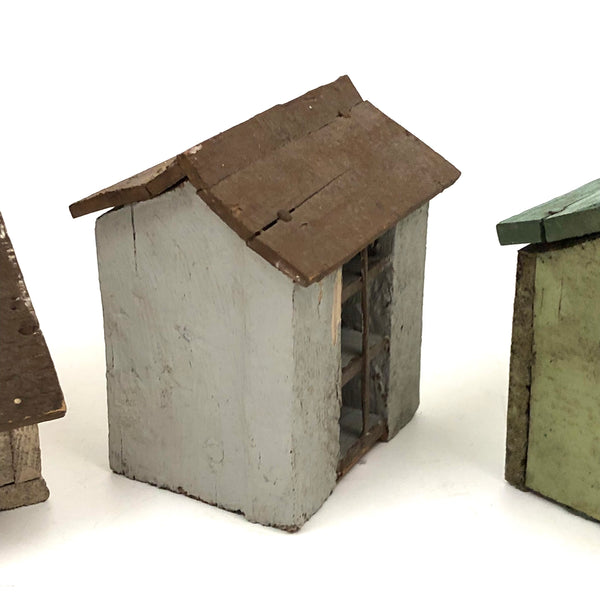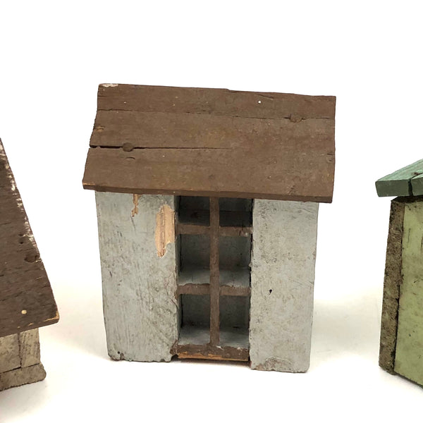 There are some very fancy folk art houses and then there are very humble ones like these, which I course fell in love with immediately. Hard-scrabble feeling, which makes them feel very tender and empathetic to me, and with the two-toned green one a great anchor for the group. The wonderfully tall and chunky chimney on the squat white one also makes a perfect pedestal for one of its companions. Honest, unfussy, and to my eye super charming.