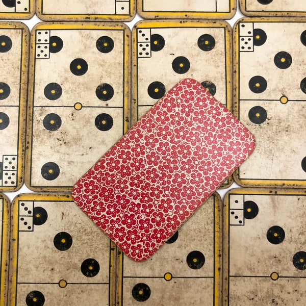 This is the second set I've found of these c. 1910 Charles Goodall & Son of London, c. 1910 double nine domino playing cards, and though this set is quite worn, they're complete, rare, and I still think beautiful. I especially the yellow borders and how each card features a mini version of itself in the far corners, plus pretty red and white flowered backs. They are still great to play with, and fit snugly in their (completely taped together but sturdy) original box, small enough to put in your pocket and take anywhere.