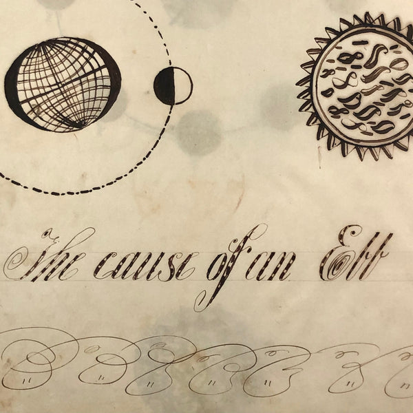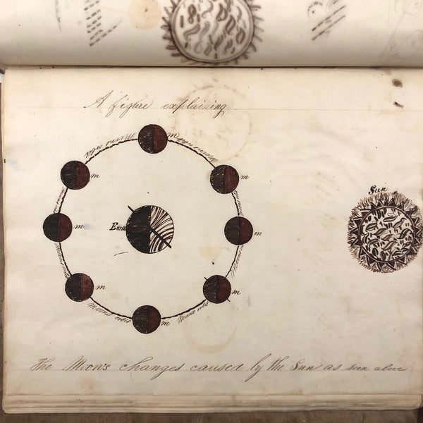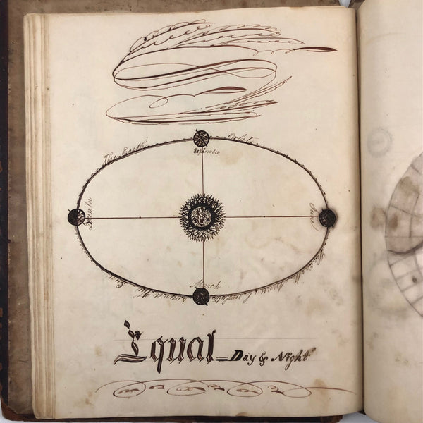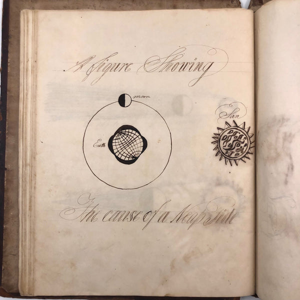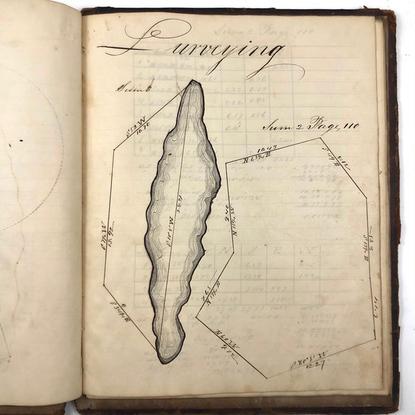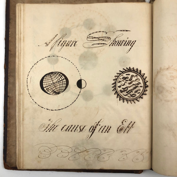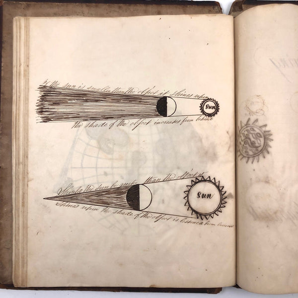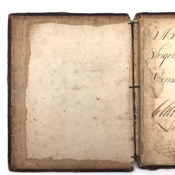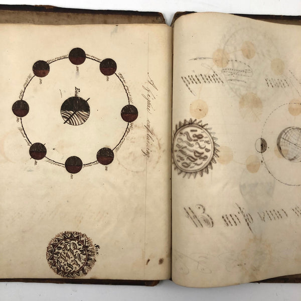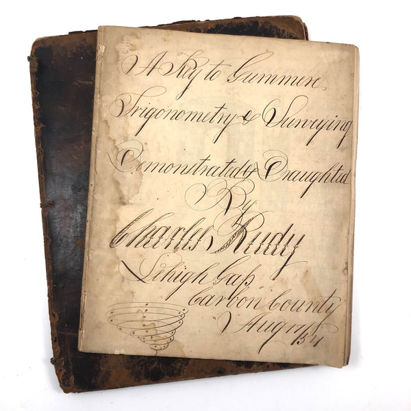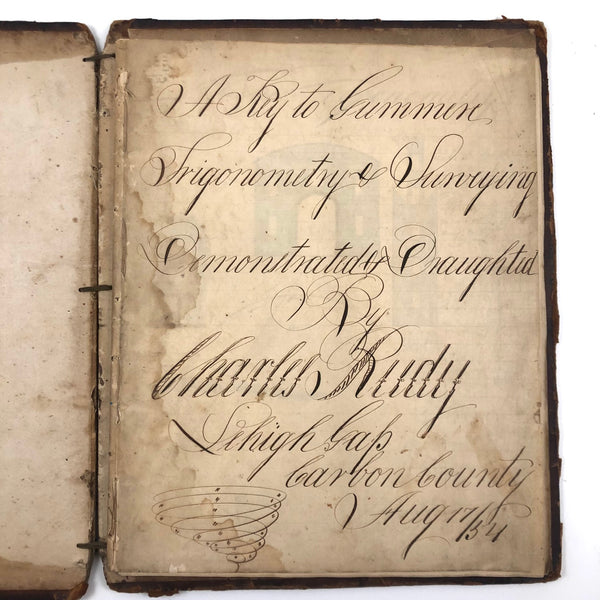 I didn't know it when I found this, but turns out that its maker Charles Rudy (b. 1837)—the super bright and very entrepreneurial youngest child of Durs Rudy (a Swiss immigrant who kept a store and hotel, became an organist and was also, interestingly, a talented fraktur artist)—would become quite a notable figure not just in Lehigh Valley, PA, where he grew up, but in Paris, where he established a school that became a hub for international nobility and the sons and daughters of many of Paris’ most fashionable citizens. Rudy founded the early iteration of his “Schnecksville Academy” in PA c. 1856, at the age of 19, where to 36 students he taught all the courses, including music and drama! I believe this 1854 notebook—titled “A Key to Common Trigonometry & Surveying Demonstrated & Draughted by Charles Rudy” (and including a series of wonderful drawings relating to astronomy, tides, etc. at the end)—was likely an early draft of a teaching notebook. There is tons more about Rudy’s fascinating life online, including a great long article in Lehigh Valley’s Morning Call.