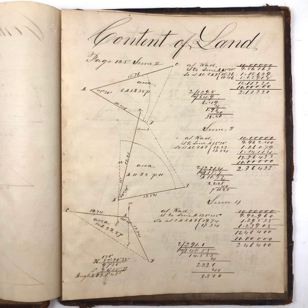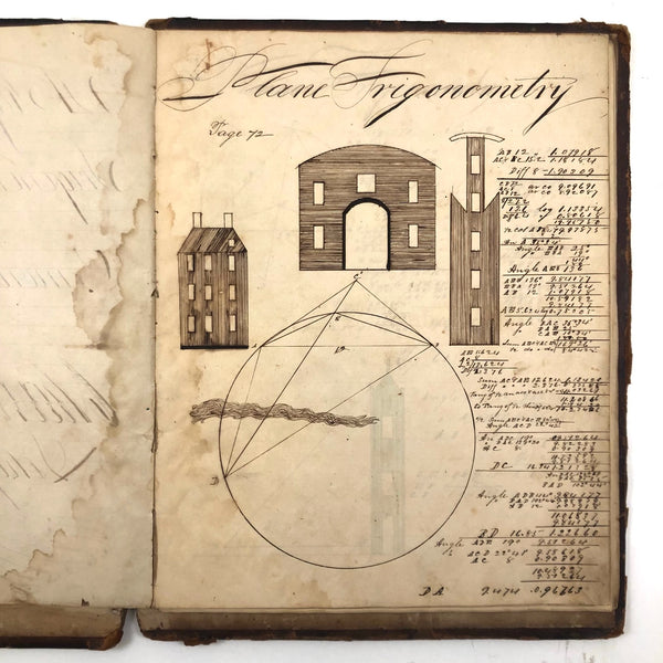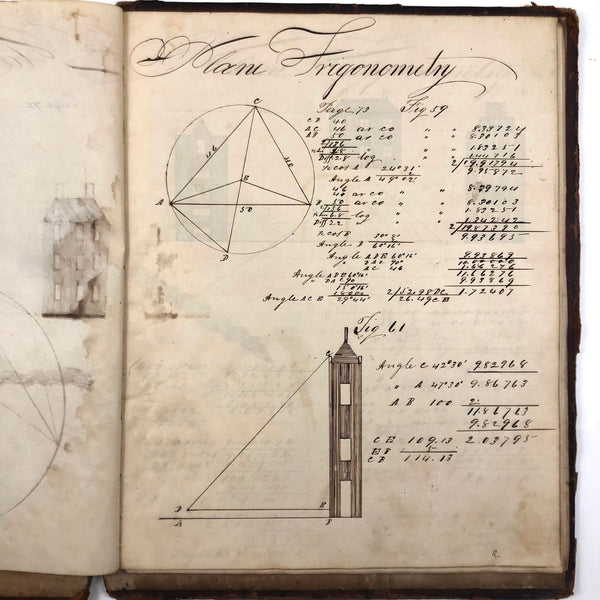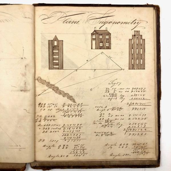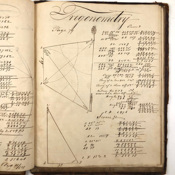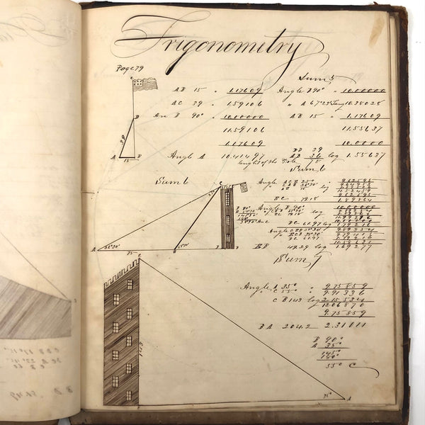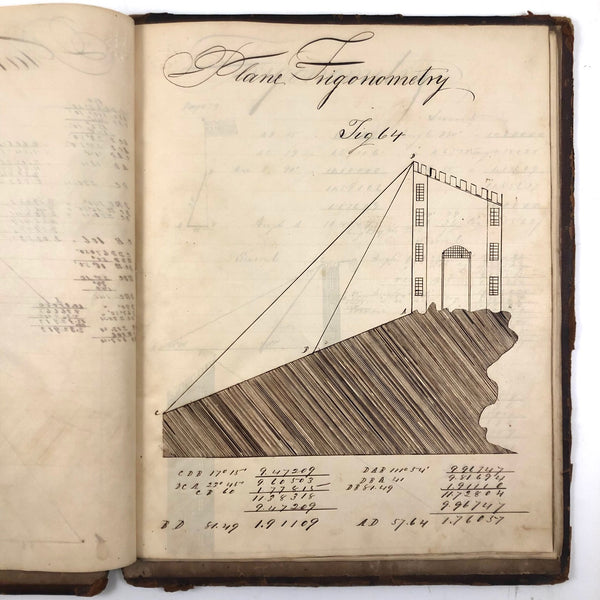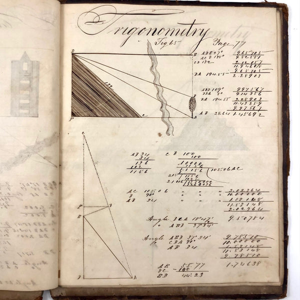 The notebook, which floats inside a beautiful old leather cover, includes 48 pages total—26 of them at front filled mostly on one side with trigonometry and surveying exercises including beautiful diagrams, then 10 blank, then twelve pages at the end with suns and moons and ebbs and tides and a few misc. sketches.