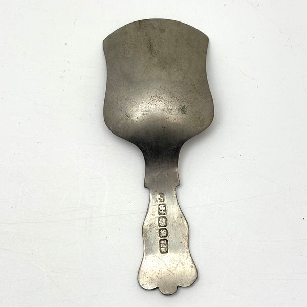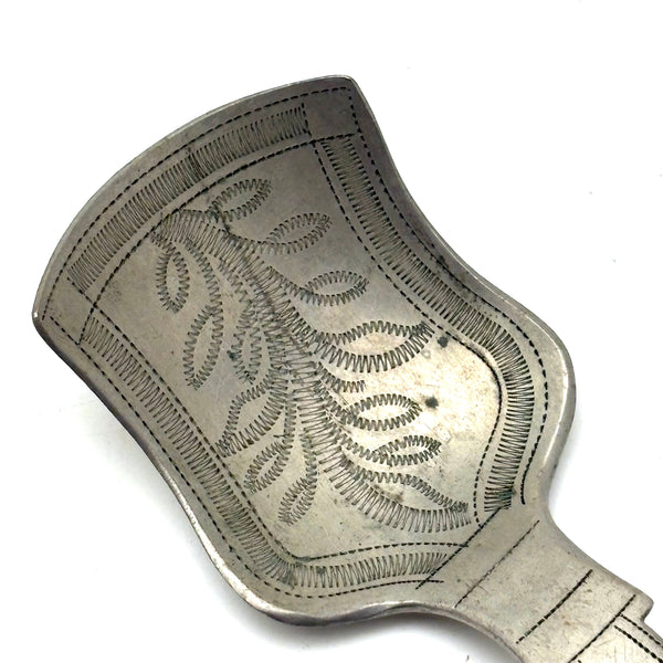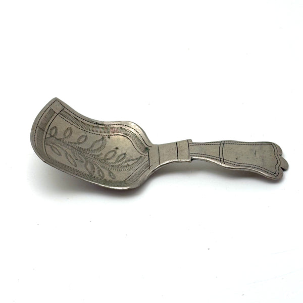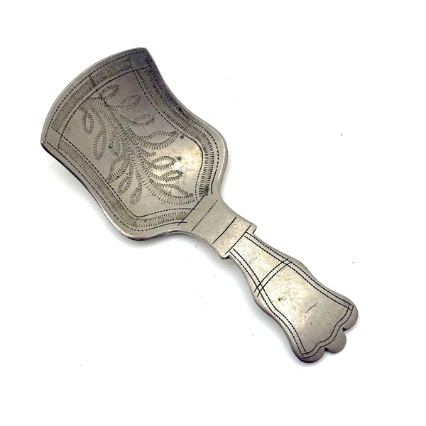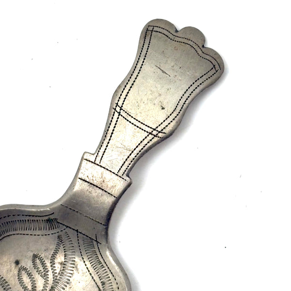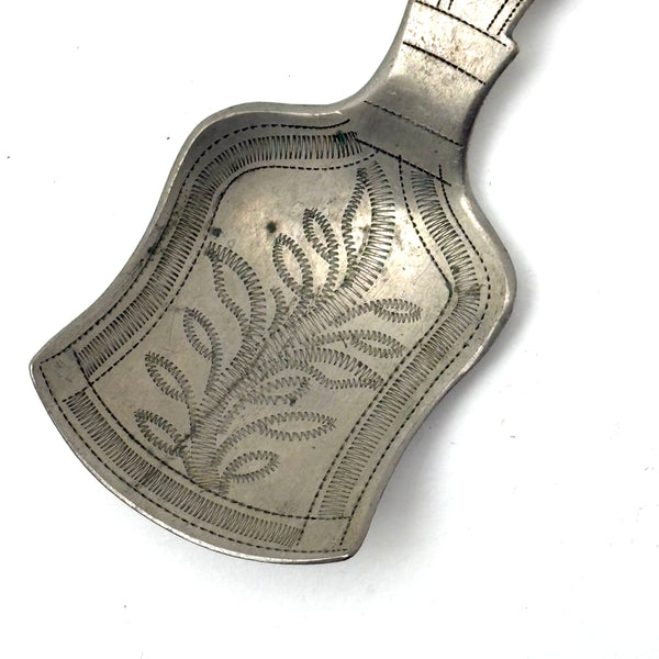 I didn't know I was looking for a tea caddy spoon, used for scooping loose leaf tea from a tea caddy into a teapot, but I came across this and fell in love with it, for the form and especially for the very folky engraving on the bowl, done I believe with hammer and graver (like a fine chisel) and which always makes me think of trench art. And that engraving happens to be very closely aligned with the engraving on a charming tole snuff box shoe also listed today, both I believe early-mid 19th century. There are hallmarks on the back of this handle that I am not knowledgable enough to decipher, but surely that's a crown at center (the crown of the Sheffield Assay Office I believe?) I believe this is silver plate.