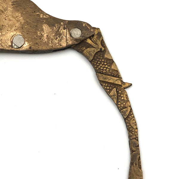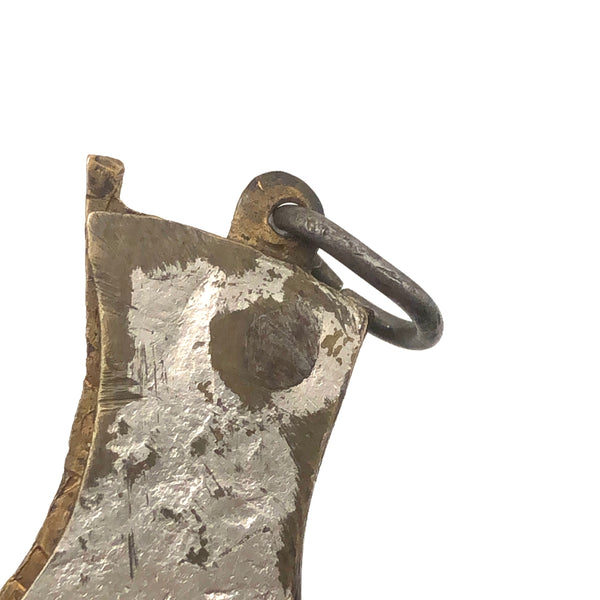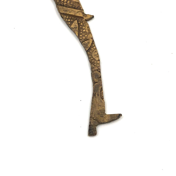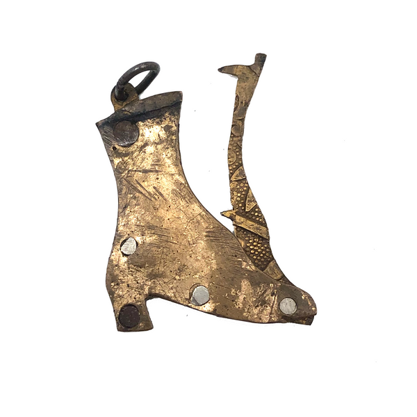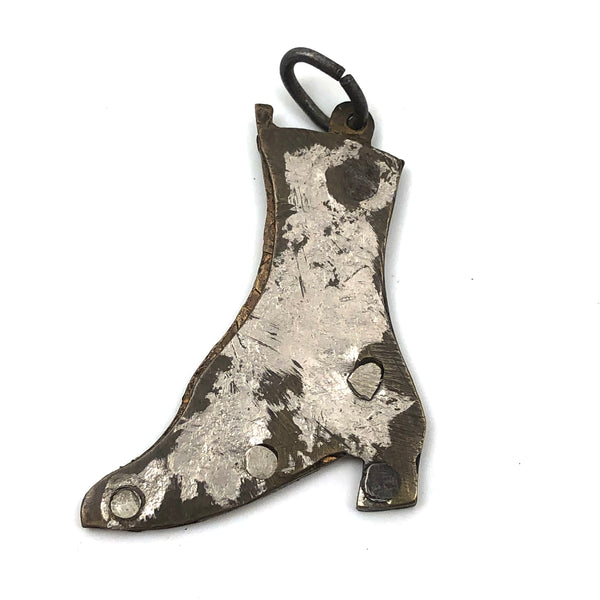 A charmer of an antique charm, and a functional one too--a boot shaped boot lacer, with "hook" that folds out to be used to pull one's laces tight. Made of brass I believe, with a bright gold toned surface on one side and silver on the other, with decorative embossed patten on the brass of the hook. I've never seen another like this, a wonderfully folky thing, perfect for stringing on a chain now and wearing as a lucky, and handy, pendant!