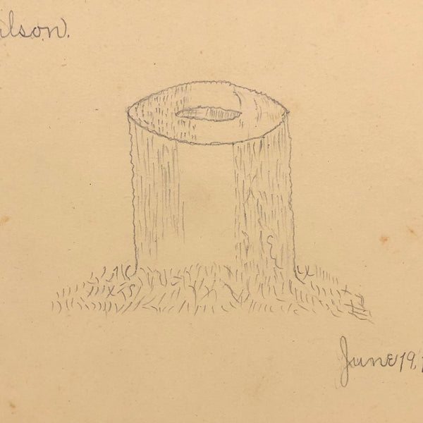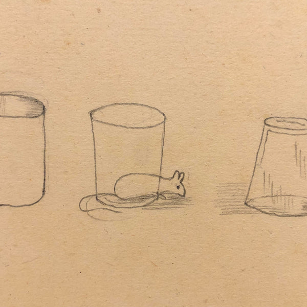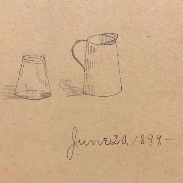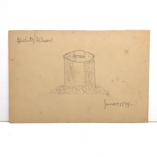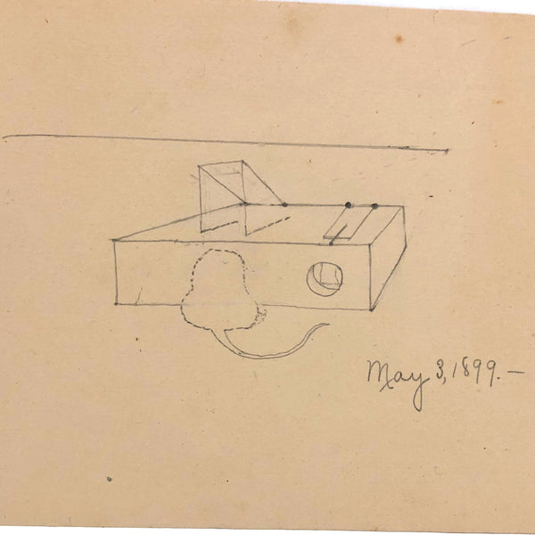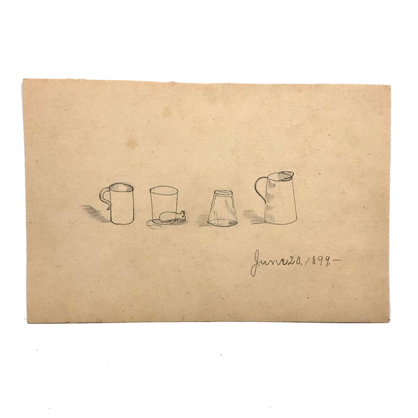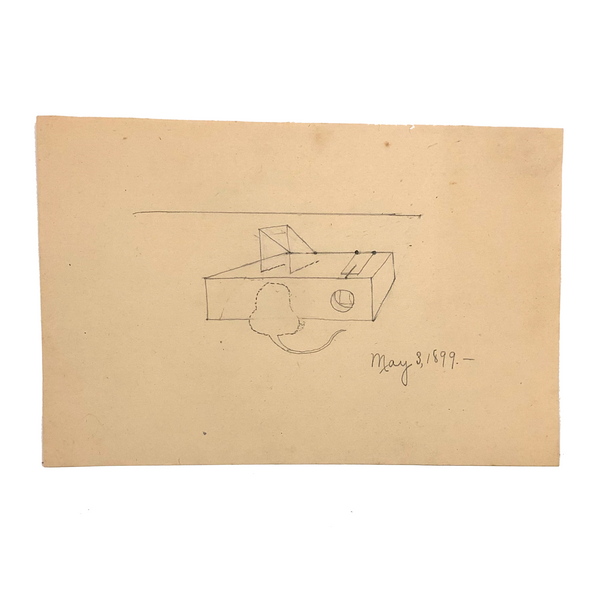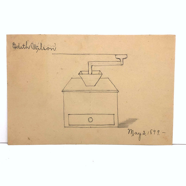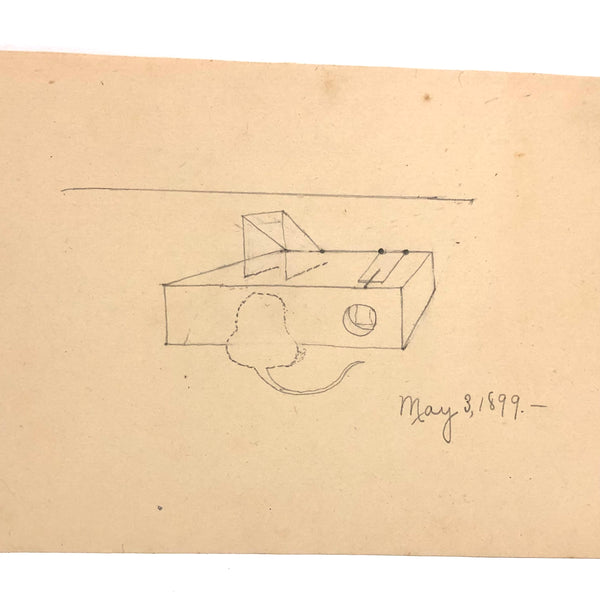 A delight to find these--seeming to me perfect complements to one another, so I'm selling as a pair, with the sweet little mouse creeping around the vessels in the first surely the same showing its tail as it enters (or perhaps is just inspecting!) the mousetrap in the second! Done by an Edith Wilson and dated 1899, graphite on natural colored paper, with a lovely, quiet precision about them. And two more drawings on reverse, of what looks like a coffee grinder and a tree stump. Love.