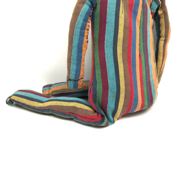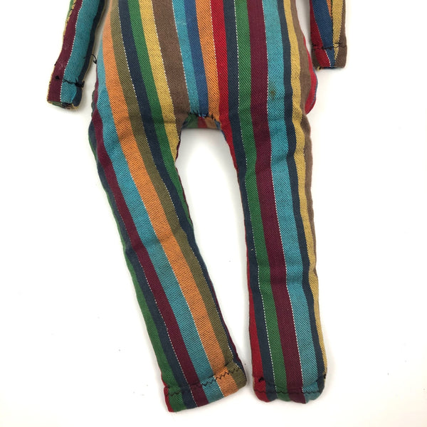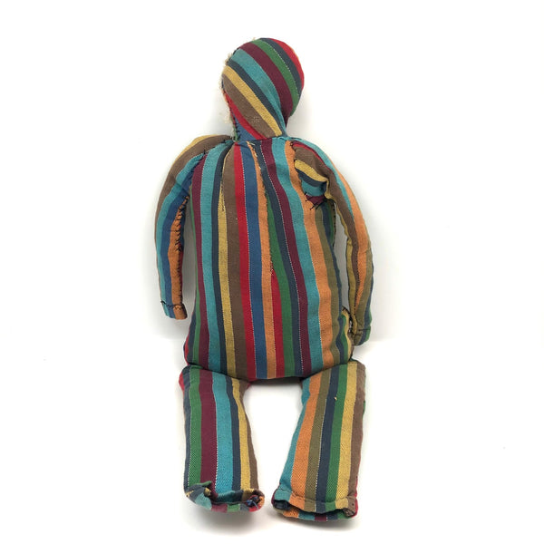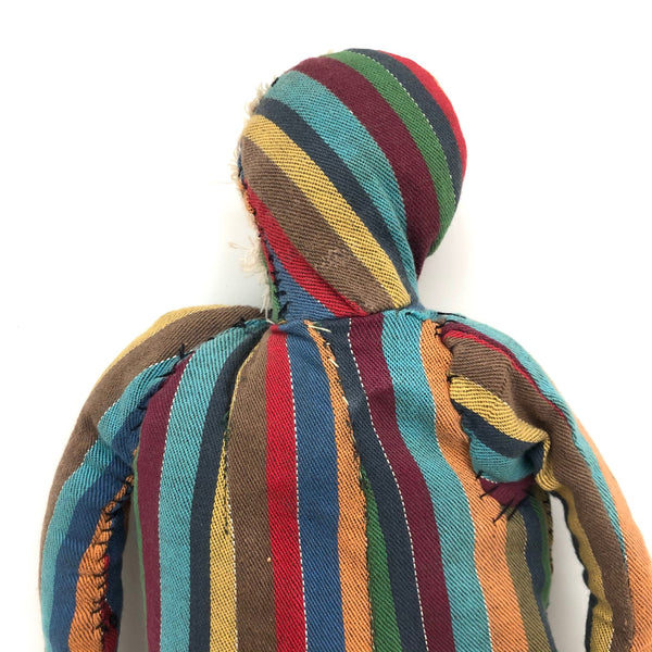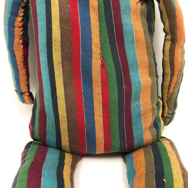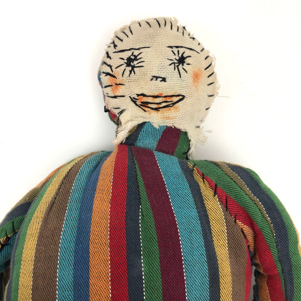 Whoever made this charmer threw everything but the kitchen sink inside of it I think, there's some crinkling of what what I think are plastic bags inside the legs, and something that feels kind of like a small hot water bottle inside the torso, which makes its back stand up straight (and perhaps it once made a squeak, I don't know)! The person who sold it to me thought depression era; I'm not completely sure, but it most certainly has a make-do sensibility, and no great finesse was applied to some of the stitching, which is part of what I love about it. And then that face, with some orange paint or stain for the cheeks and mouth, these fantastic starry eyes and stitches along the border that both hold it on and give it a hairline. Hard not to feel a little happier with this around.
