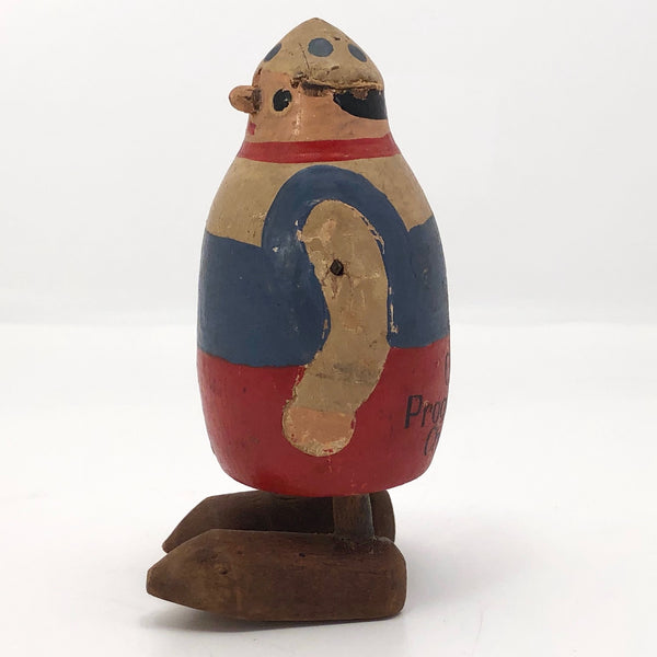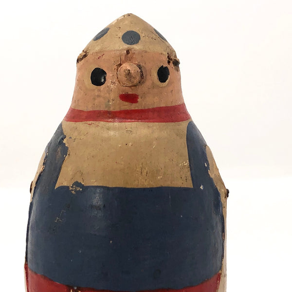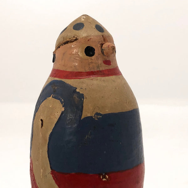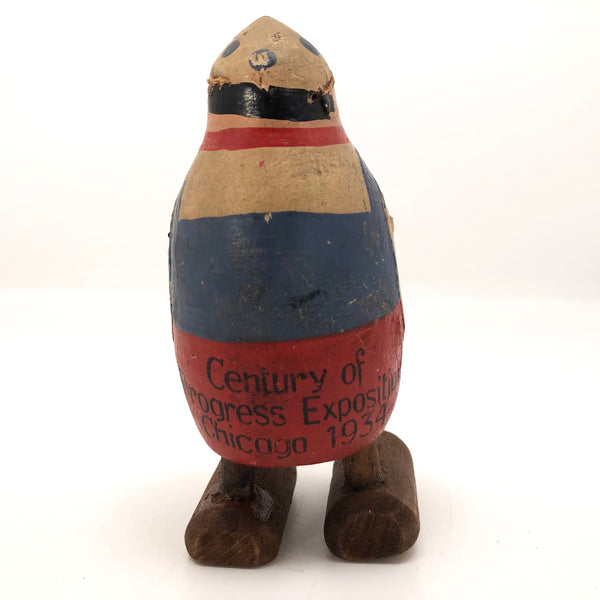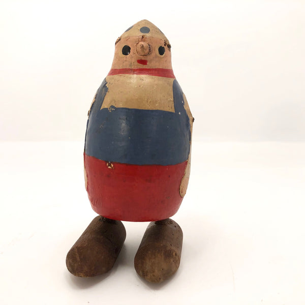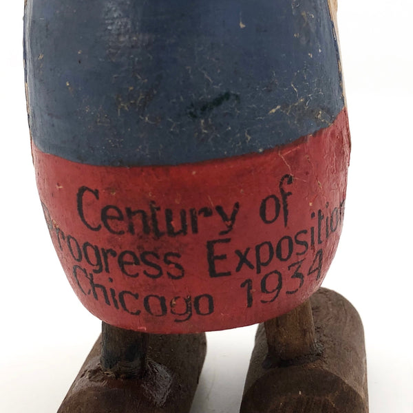 This fabulous Czechoslovakian wooden "ramp walker" toy was a souvenir from "A Century of Progress," an international exposition at the 1934 Chicago World's Fair, which focused on the theme of technological innovation. I am not so sure he embodies a great step forward in terms of technology, but what a charming little figure he is, and quite a rare one, I've learned. He's been carefully hand-painted with a sweet face, fabulous polka dotted hat and terrific blue and red outfit, and "Century of Progress Exhibition Chicago 1934" on his back, plus a long pinkish wooden nose, and his giant walking feet!
