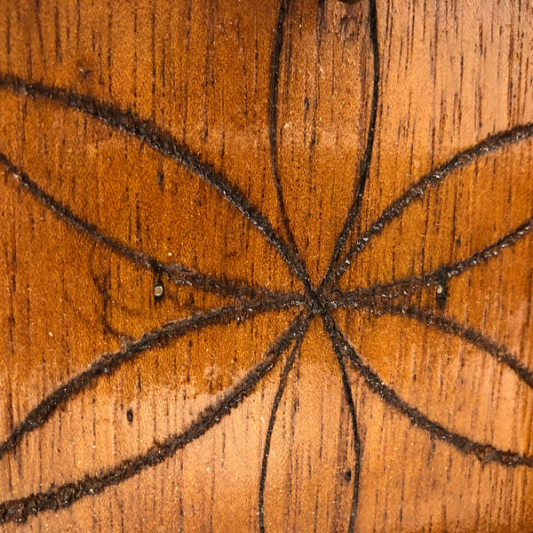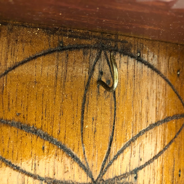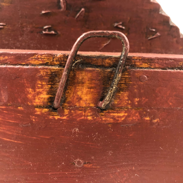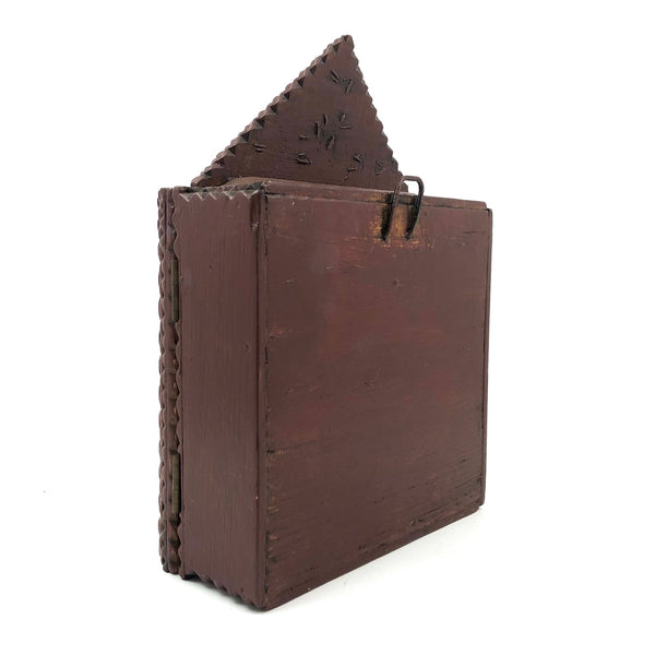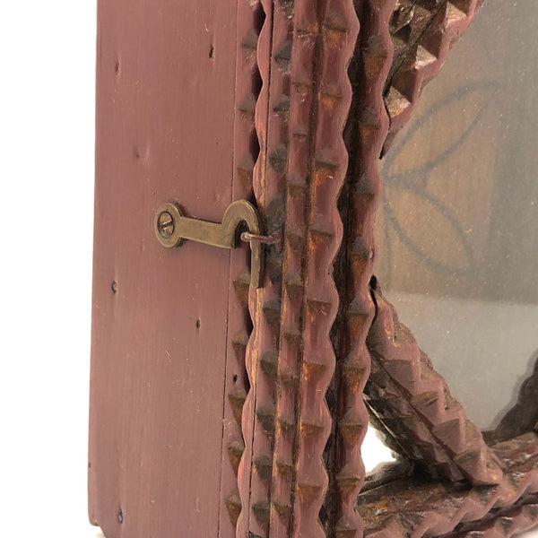 This old tramp art box, with a hook at the top of the interior back, I believe was made to as a case for a clock or pocket watch, but there are all sorts of other things one could display in it now. I really like the mirrored corners, and the hex type star that appears to have been pyropgraphed into the back panel. In excellent condition, painted a dark burgandy red, and with a hook on the side that latches tight.