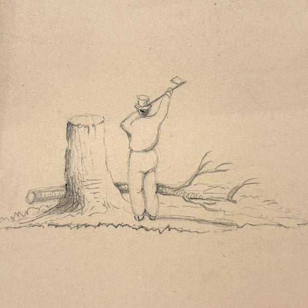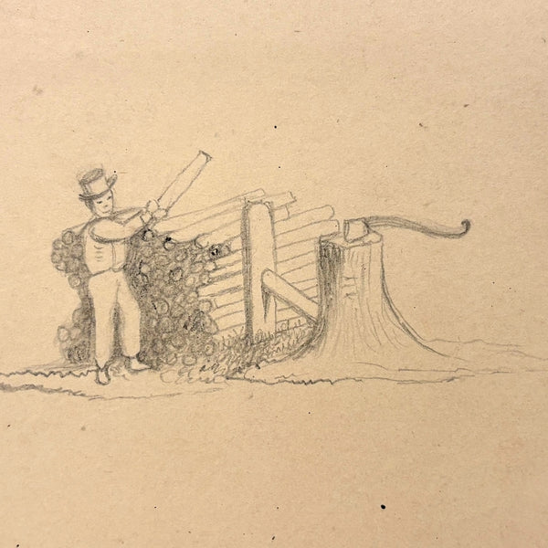 This came out of a large c. 1870s century folio filled with all sorts of things, including a whole notebook of geometric perspective drawings, listed separately, and an assortment of handwritten notes on everything from wax flower making to casting. Included were a handful of single pages with perspective drawings and notes---and then two graphite drawings of a different ilk, this and a second also listed, each featuring four related vignettes; here, it's all about chopping! A wonderful sequence, with empathetic tree and protagonist both, I think--taking one chop, then felling the top of the tree, then chopping it into pieces and piling them up. A total charmer of a drawing I think, which seems to me an excellent one to gift to one's favorite wood chopper or task master!