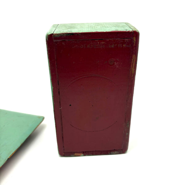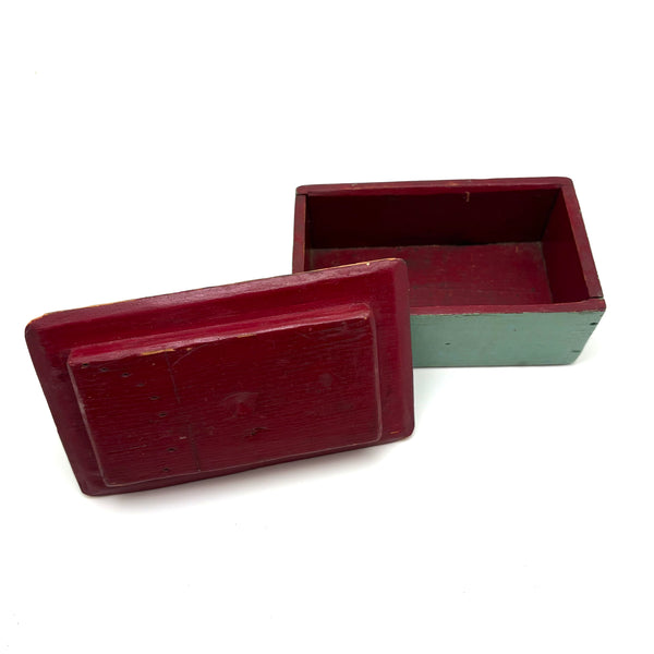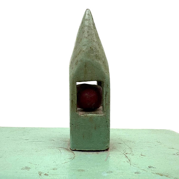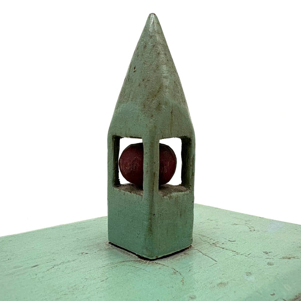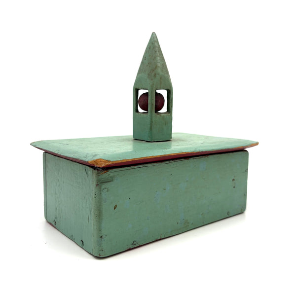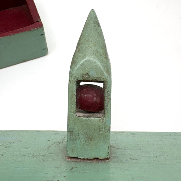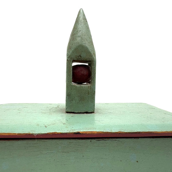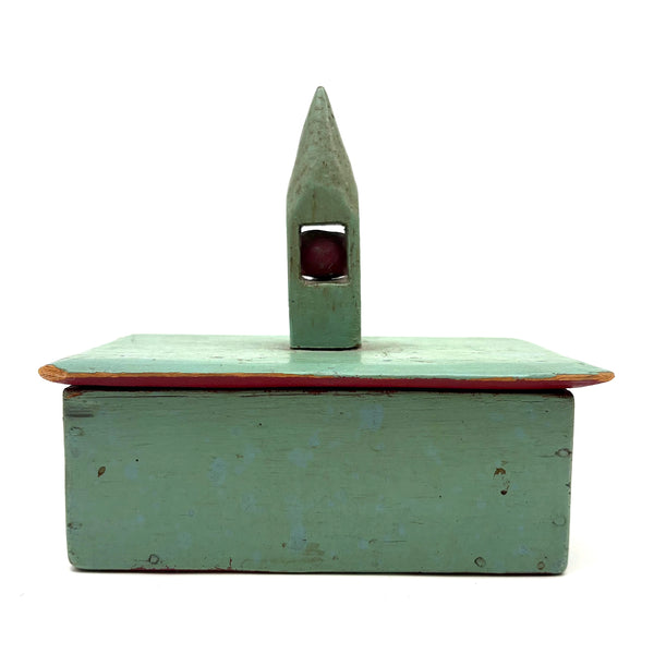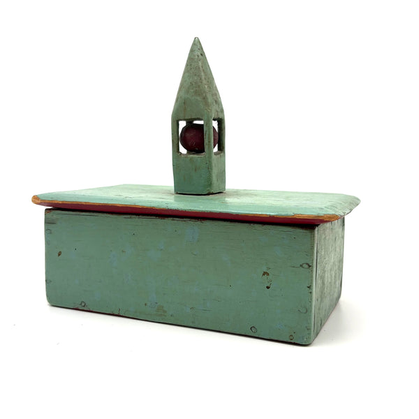 This is one of my very favorite Brimfield finds; to my eye a perfect thing, including for how the combination of simple box and pointy ball in cage whimsy renders it, in just about the most concise, minimalist manner possible, a piece of tabletop architecture: a church with a steeple. I'm forever on the hunt for old painted whimsies, hard to find and as good as can be here in sea-foam green with dark red ball inside--but how much better attached to a homemade box with great lines--and a red painted interior too. The whimsy is attached to the lid of the box from the inside, with a second panel on the underside of the lid concealing what I think is likely a screw attaching it. Really excellent.