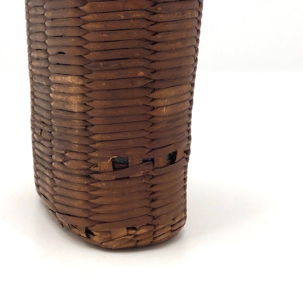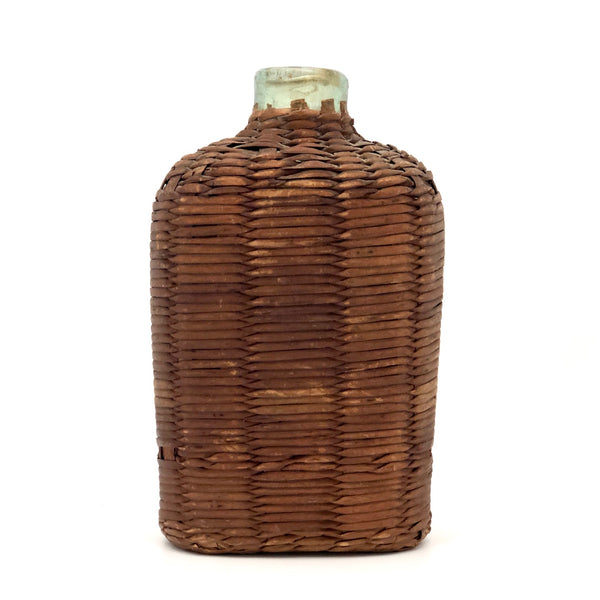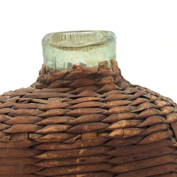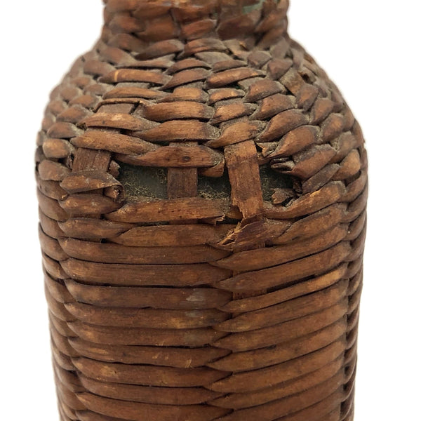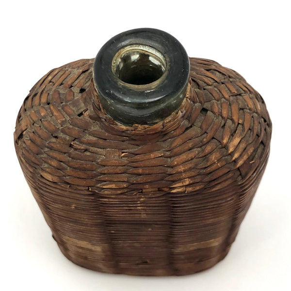 I found a precise match of this wicker covered flask--same exact wicker, weave style and details, and same thick blown glass--listed by a Civil War expert, who also points to one in the Gettysburg Museum collection. While I can't say for sure this one saw battle, I am confident it is of the proper age, and know that these flasks were very popular with soldiers, as they were small enough to easily be conceal in a jacket pocket or haversack. It would originally have had four small wicker sling loops for a narrow cord--one can see on the sides, at shoulders and near the base, where these would have attached. Pretty cool.