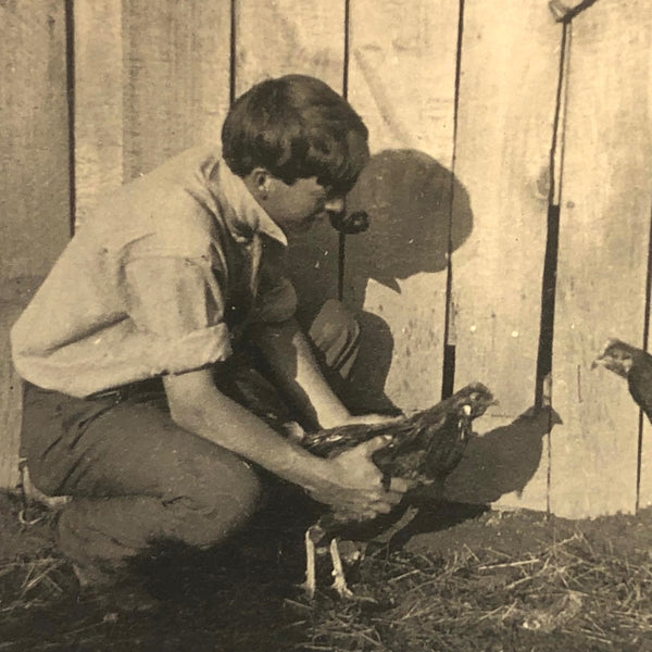 This one just struck me as quite poignant: two boys of about 14 I'd guess, facing off with cocks in hand--and with the shadow of what looks to be a woman in skirt hovering over them. A nasty sport for certain, but there is something tender and intimate about the photo, and one imagines these farm boys feeling about as trapped as these birds. With a wooden hook or hinge just above them, exactly centered between the two as if marking the center of the "ring.".