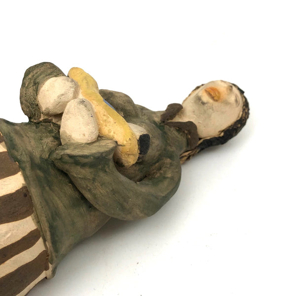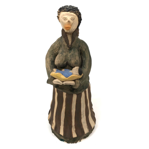 I am not entirely certain the origins of this one; I believe South American, and might guess Brazilian. A very Madonna-esque mother for sure, with wonderful face and bell-like, coil built skirt painted with excellent stripes. And what a lucky baby, cradled in yellow blanket between her joined hands and very large busom, gazing up at her. Another one that would make a great gift for a mother, I'd say, and to my eye just a charming piece, awkward in all the right ways.