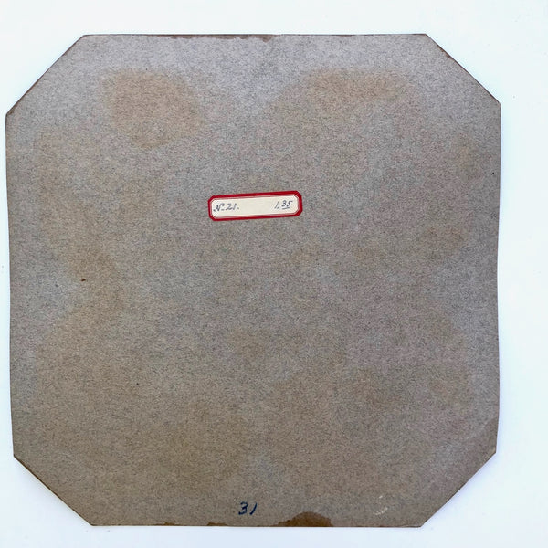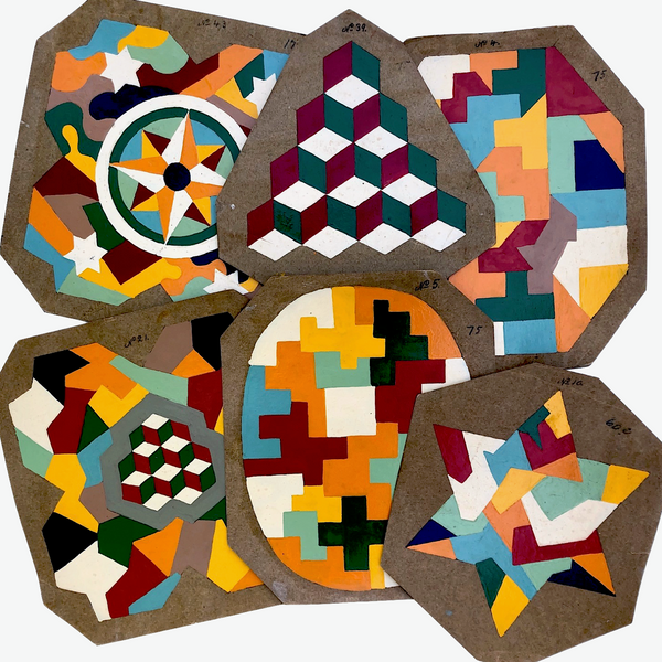 I just picked up six of these brilliantly colorful pattern paintings on lightweight board and think they are just gorgeous. They are hand numbered in pencil at top center (this one is 21; the highest number of them is 43, so there were once a whole lot of these). My guess is that they were a (well done) art/design school exercise, but at some point, also in pencil, prices ranging from 60 (.60) to 1.75 were added at top right, reiterated with hand-written price stickers on the back...so at least at some point a fair while ago they were offered for sale, which makes me wonder a bit if they were in originally made with that intent? Or were plans/sketches for designs to be painted onto something else?  At any rate, they’re just great looking frame worthy things now, and also stiff enough to just prop somewhere. And the colors—I believe acrylic paint—are even brighter and lusher than photos capture.