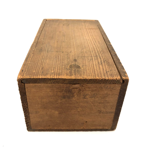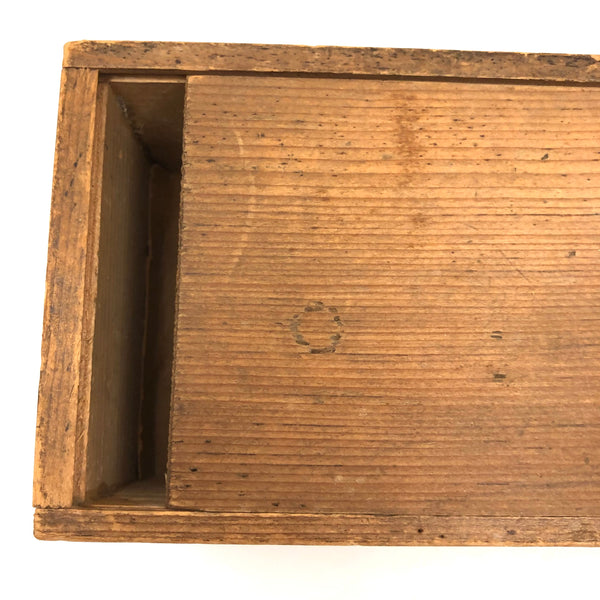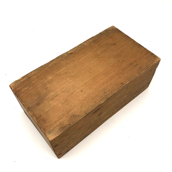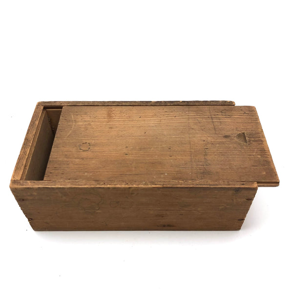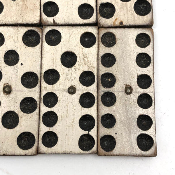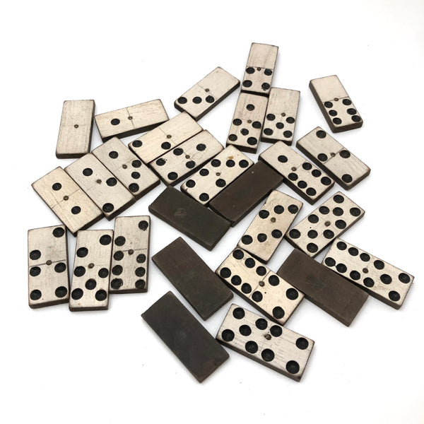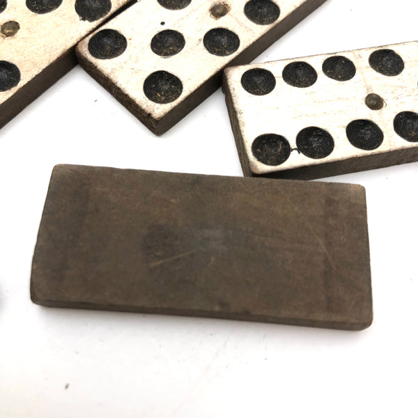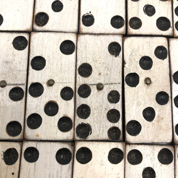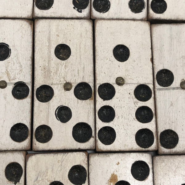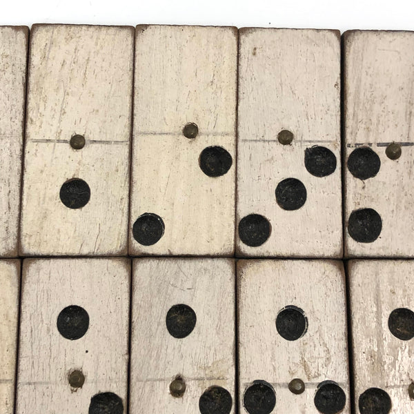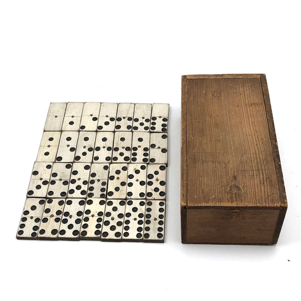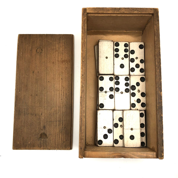 I've bought and sold a fair number of sets of antique bone dominoes, but it is actually a much rarer occasion that I come across a set of homemade white painted wooden ones, and this is a lovely set. Nice irregularity to the placement of black dots, but also very smart and crisp looking, and with brass spinners at their centers, too, which work great to set them spinning (a nice diversion while one's opponent decides which bone to play!) A complete double six set, perfect for playing with, in beautiful condition, early 20th century I would guess. I put them in this old slide lid box--a larger box than they need, but really a good one, and one could throw a deck of cards in there too!
