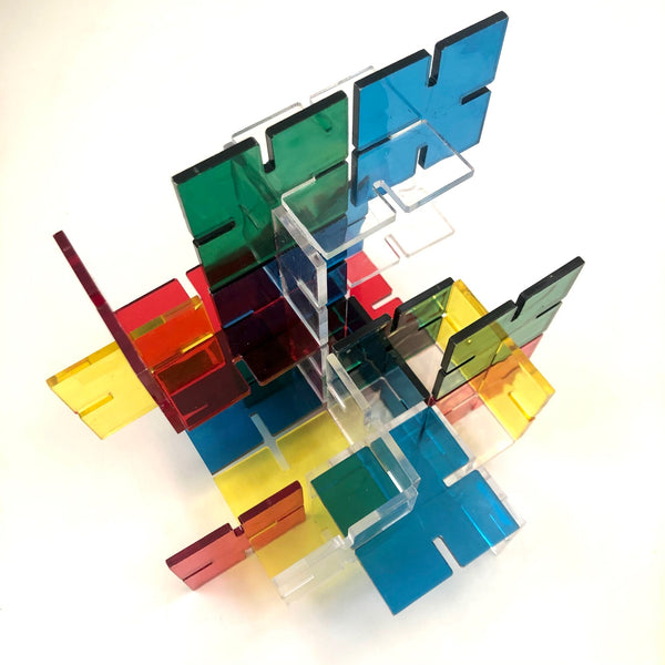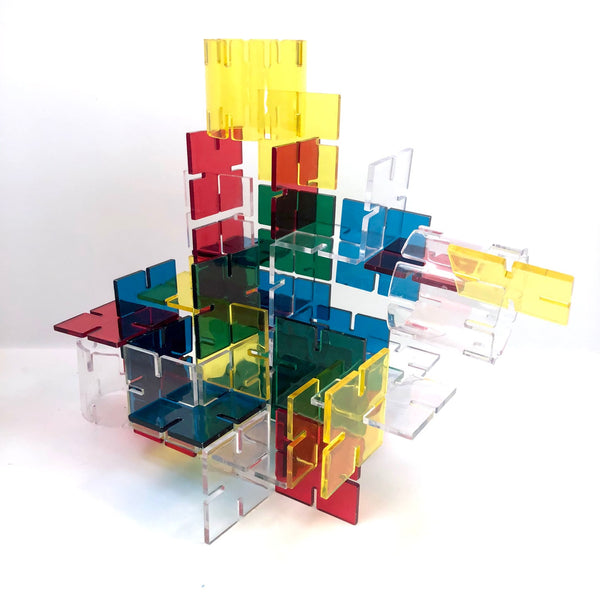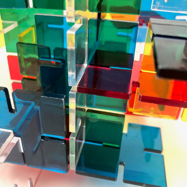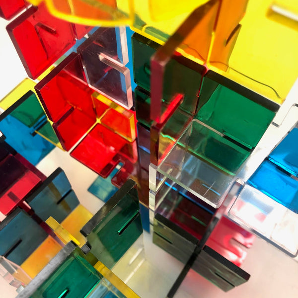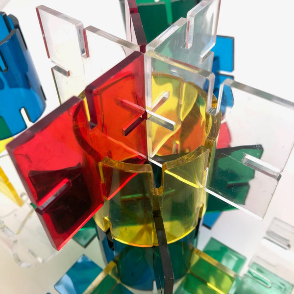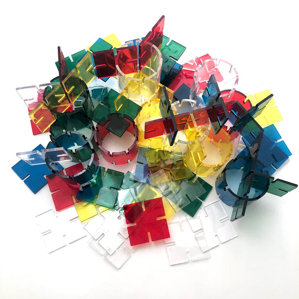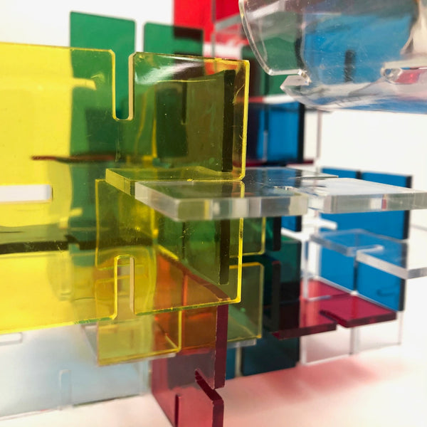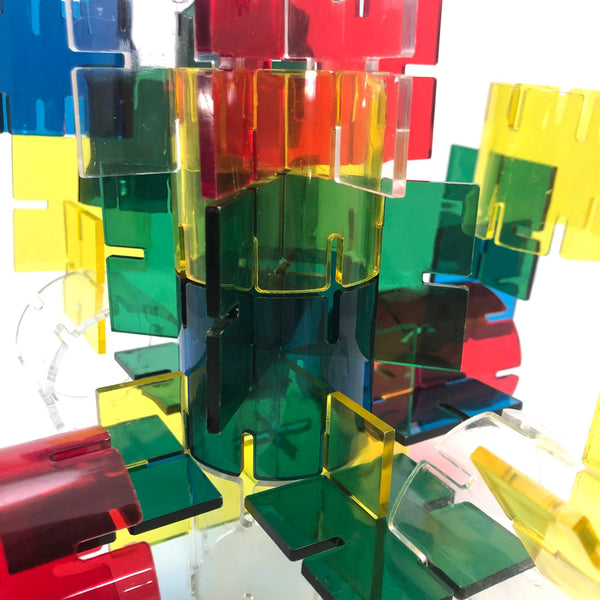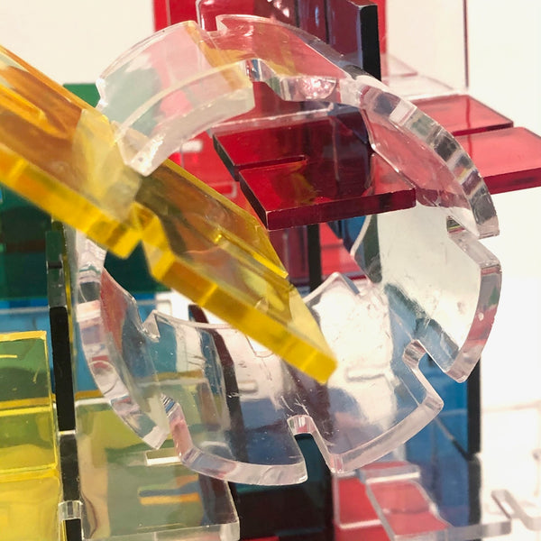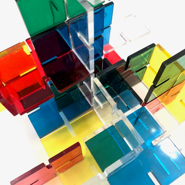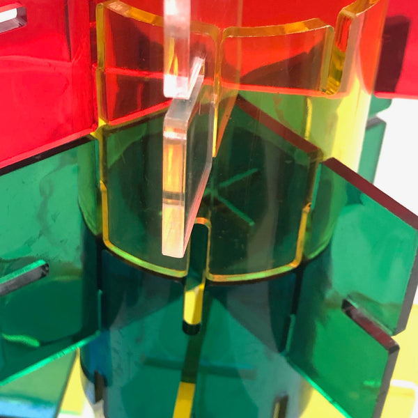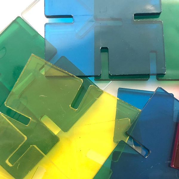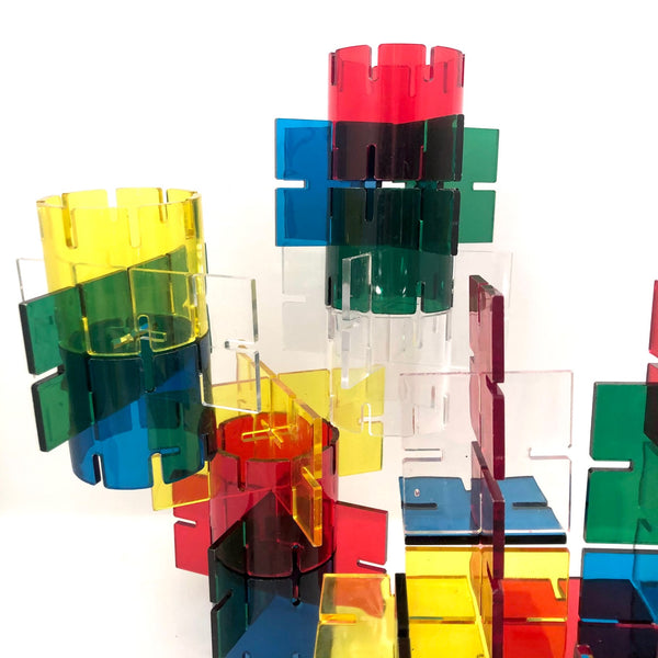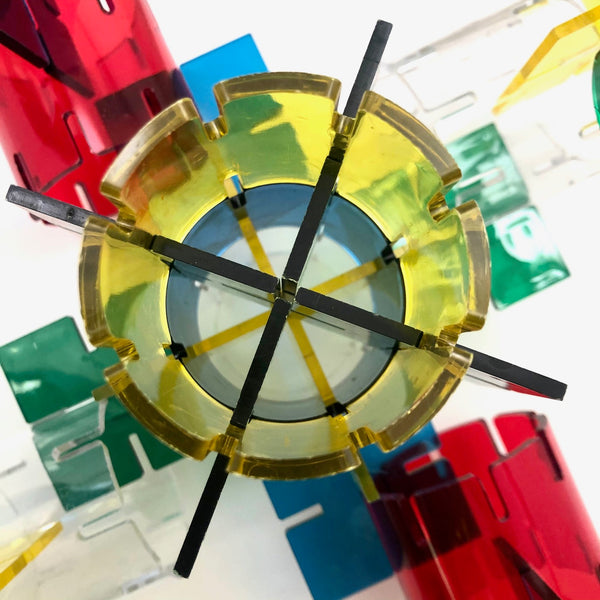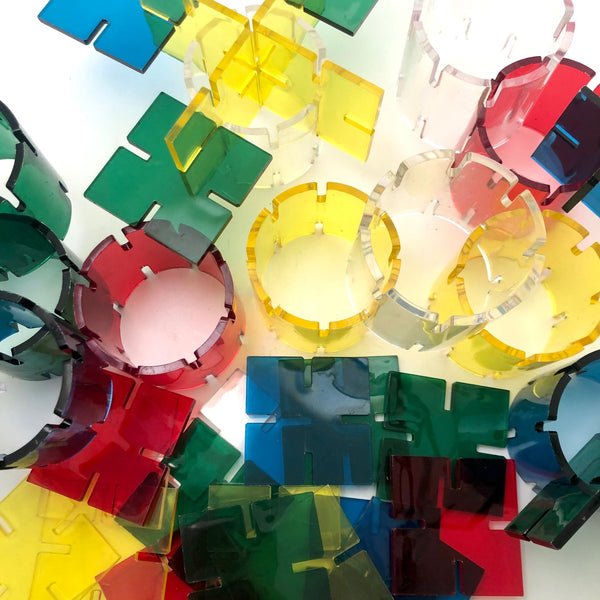 I had a set of these Galt Playplax pieces when I was a kid, and I swear not a week goes by that I don’t think of them. As a child, there was something super magical about them, and I remember spending hours building with them, then peering through the kaleidoscopic towers of rings and squares I'd constructed, studying how the colors merged and the shadows they cast (I recommend using these on a white table!) Now that I have a set in hand some 40 years later, I’m still completely taken with them! And they are extremely fun to photograph!