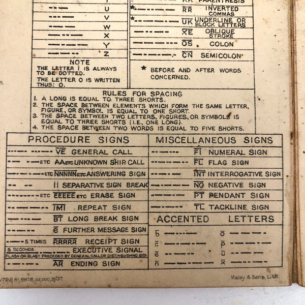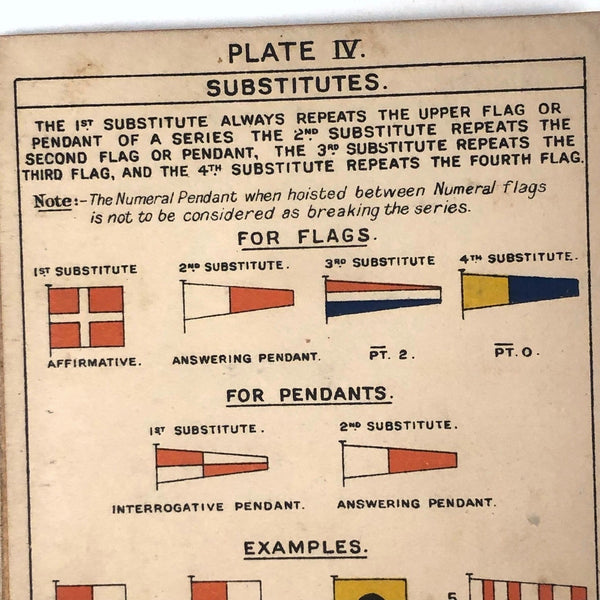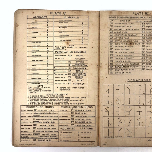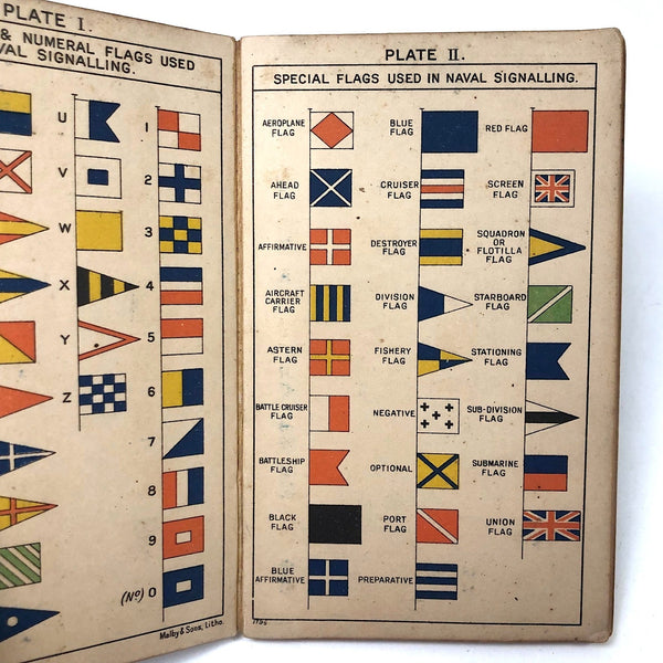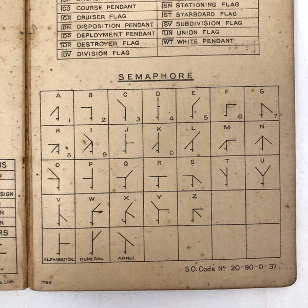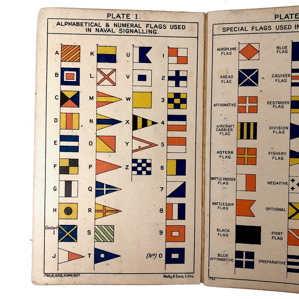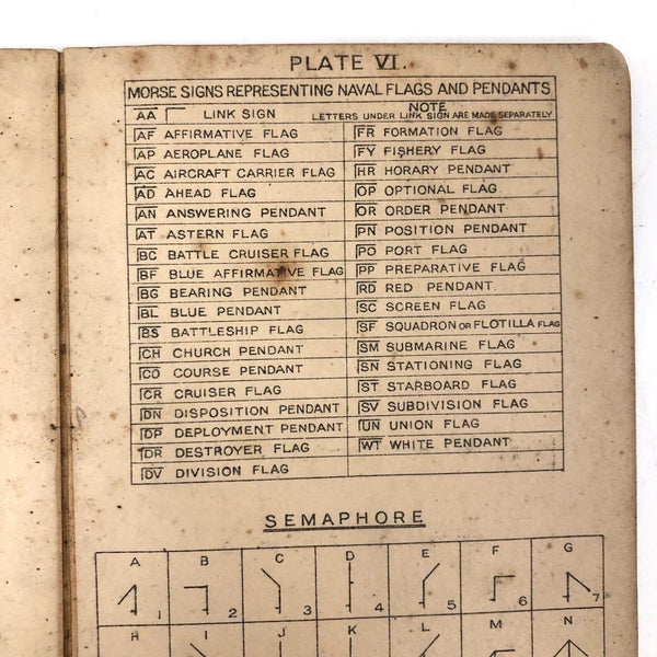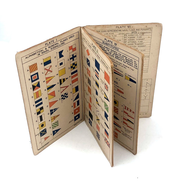 I've had a few decks of US Navy signal flag card decks, which I love (what's prettier than a bunch of colorful, boldly patterned flags speaking in code?), but this is the first of these Signal Card pocket books I've found, and what an excellent thing. Just six pages plus cover, color litho on paper adhered to heavyweight board, it covers alphabetical and numeral flags, "special" flags, pendant flags, substitutes, morse code and semaphore. Beautiful and creatively inspiring (to me, anyway) just to look at it, and has the feeling of a very essential thing whether or not one is anywhere near the sea!