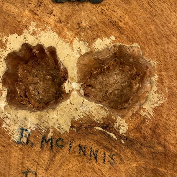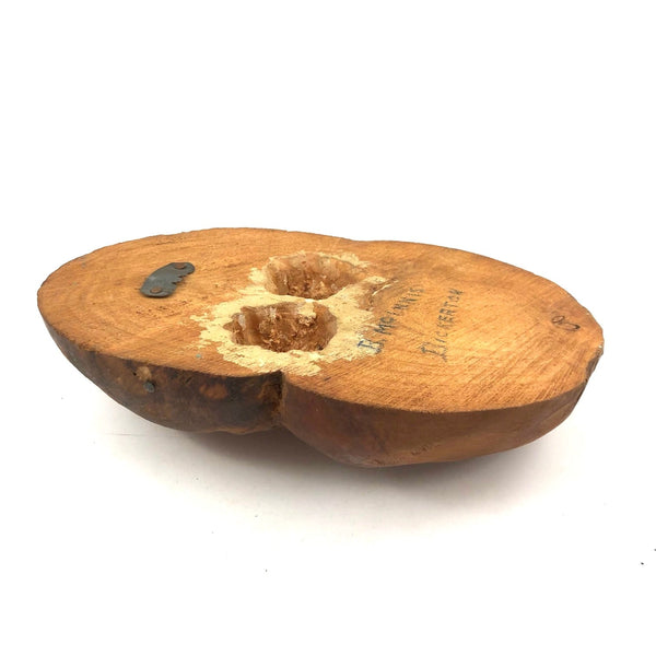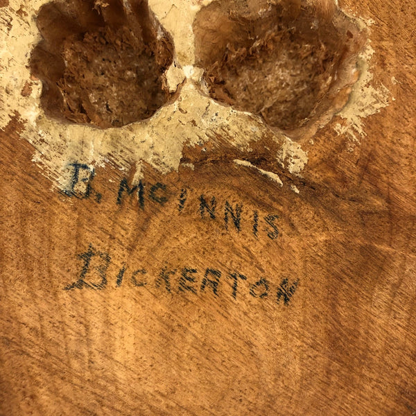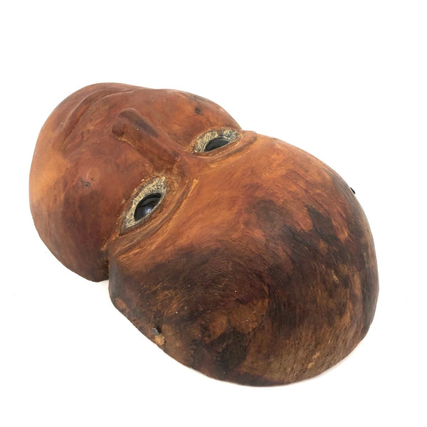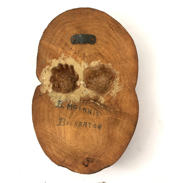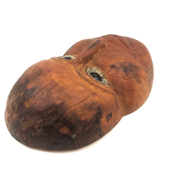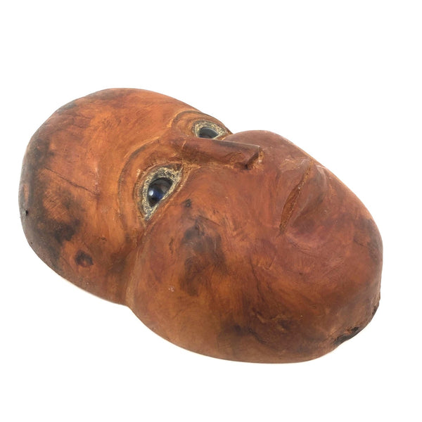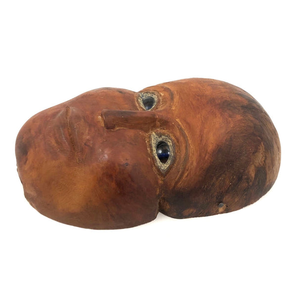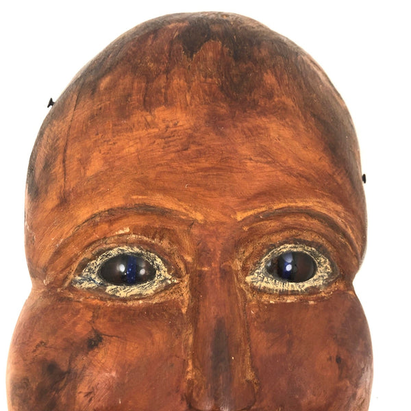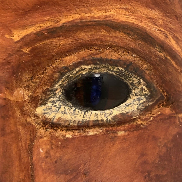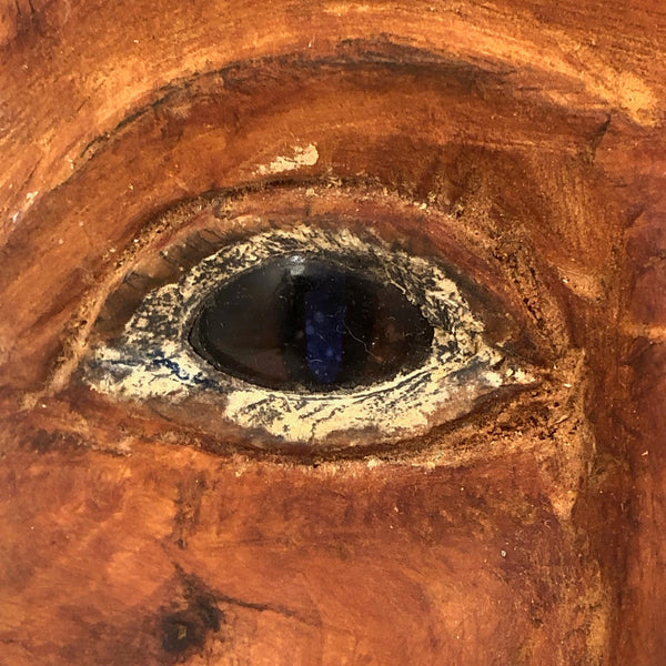 Like many I am listing today, this carved face came from the Rockport, MA estate of the late Ellen Gabin, an artist, activist, world traveler, friend and great inspiration to me when I was just get started with Critical Eye Finds. It is signed B. McInnis Bickerton on the back, which has lead me nowhere definitive, but I think it is possible the Bickerton refers to Port Bickerton in Nova Scotia. In some ways seeming to reference Inuit masks, but I believe its own special folk art thing, second half 20th century I think, with wonderfully curvaceous hand-carved form, glass eyes (which appear to have been reverse painted with blue centers then plugged from the back side of the head) and crooked smile that looks to me as if sitting on a secret. Thinly stained a warm reddish brow, with blacker stain on the top of the head and apples of the cheeks. Unusual and with a warm, strong presence.