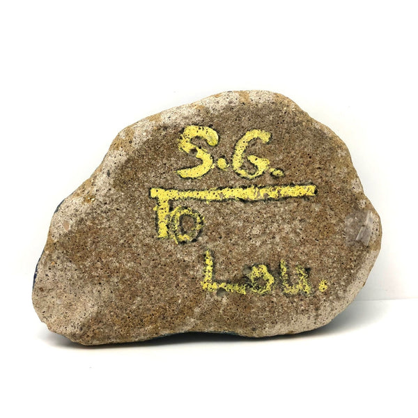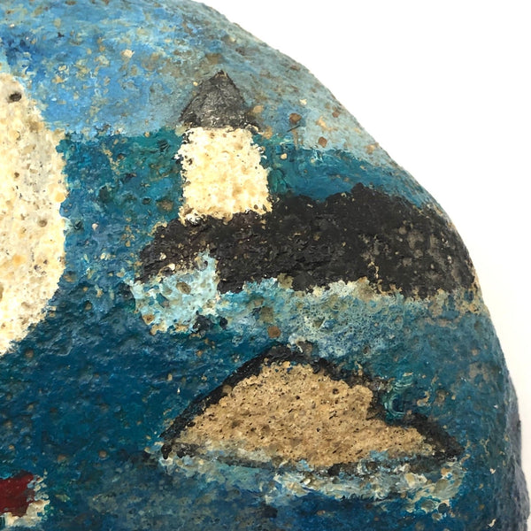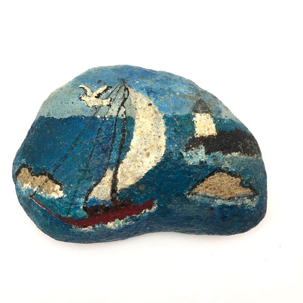 I love a painted rock, and this one, looking very late 60s/1970s or so to me (especially that flying gull, like a peace dove) was done by someone who knew how to paint a rock! Bright sea blues, red sailboat with big white sail, and a light house in the near distance, too. Signed on reverse by S.G., to Lou.  Excellent for propping open the door to the patio in summertime, or whatever.