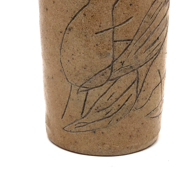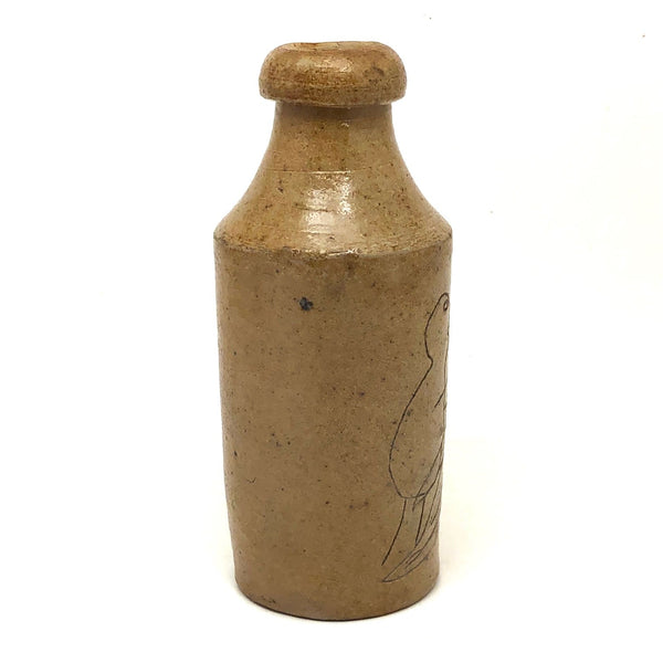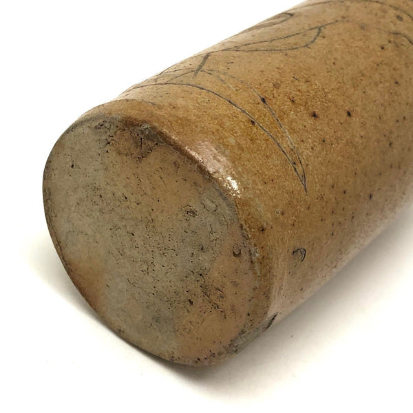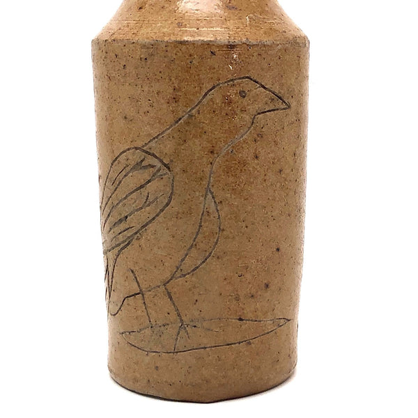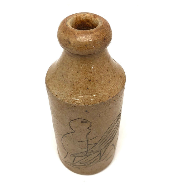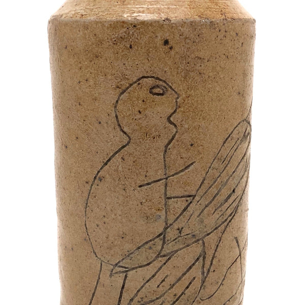 This 19th century salt glazed stoneware bottle is one of my favorite things ever, its surface incised with wonderfully naive, open mouthed figure with sticks for arms and legs and an equally wonderful bird, which the figure looks as if he's about to get on the back of and they'll fly away together. So much life and immediacy in the pair of them, which one imagines were etched into the clay with whatever pointy stick or tool was handy. Just the sort of drawing I am always looking for, but so much better for being perfectly preserved in the clay body of a utilitarian vessel. My guess is this was done by a factory worker as a sort of whimsy, perhaps making use of a slightly imperfect bottle. Late 19th c., I believe, and I think the bottle would have been made to hold beer or ginger beer, or possibly ink.