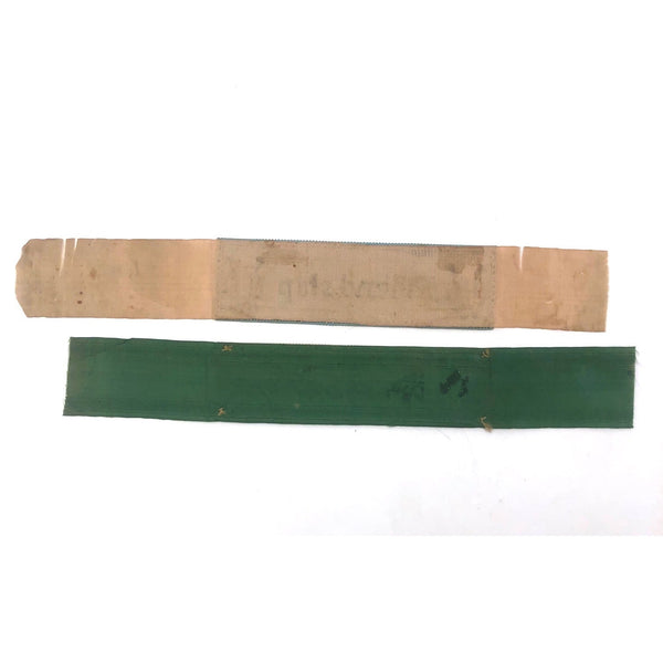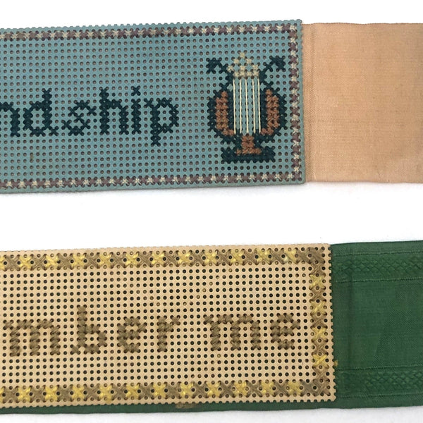 Friendship: 7 5/8 x 1 1/16 overall. Remember Me: 7 1/4 x 1 1/16. Some wear to the pink ribbon of friendship but both embroideries in very good condition.