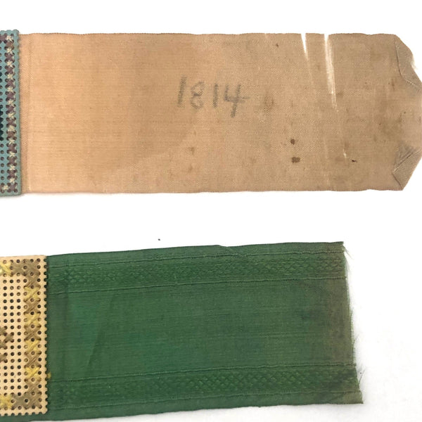 Two more 19th c. punch paper embroideries on ribbons, one of them marked "1814," I presume the date of its making, though hard to know for certain. Found together and I think quite apt as a pair, so I offer them up as such.
