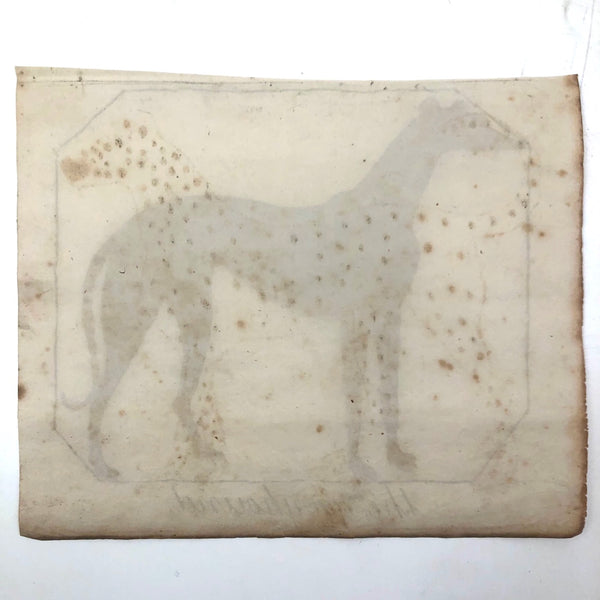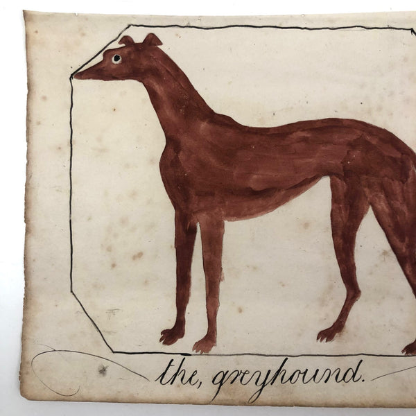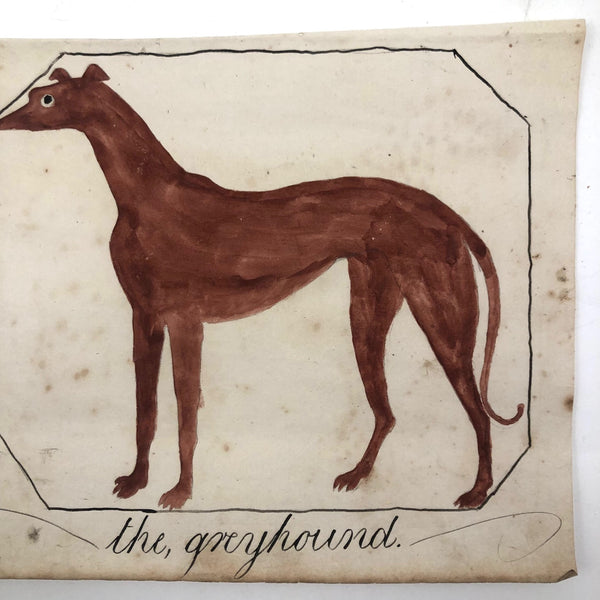 This marvelous ink and watercolor of "the greyhound" is one of a group I purchased from a seller in England, which had previously been bound together as a booklet, and which I am listing individually. Like this wonderful greyhound, each depicts a working animal in a very iconic and really quite regal manner--to my eye just about as good as it gets. The odd watercolor in the group, portraying Dick Turpin and The Brothers' Gibbet at Gonerby, was made after a famous print c. late 1830s, which dates these, as does the manner of the rendering and handwriting, to right about then.