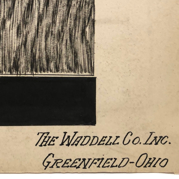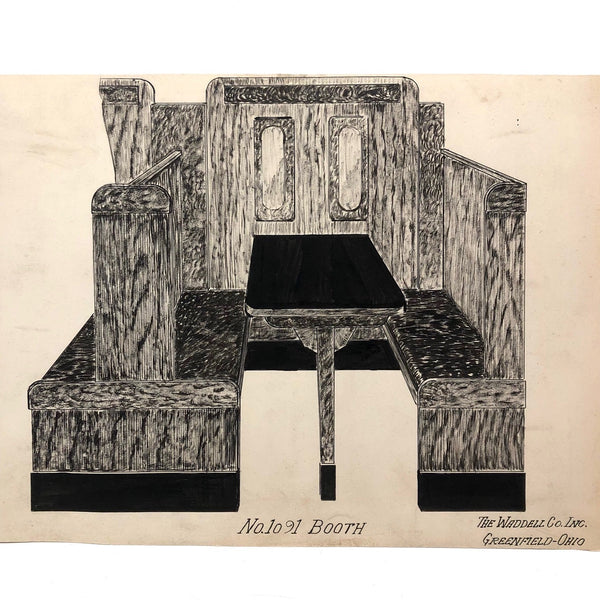 I found this one digging through a bin at the Boston Antiquarian book fair and just lit on it immediately--so boldly graphic, and also feeling somewhat anthropomorphic, with the windows (I am thinking perhaps this is a booth in a private dining car?) at center reading like eyes and making the whole thing seem like a hulking creature, which makes me think a bit of Philip Guston, too. The Waddell Co. of Greenfield Ohio (founded in 1887) first produced coffee grinders and then everything from mousetraps to cash registers, to showcases, to post office fixtures. I can't find any reference to this "booth 1091" but it seems in general keeping, and I presume this was an in-house rendering, earlyish 20th c.