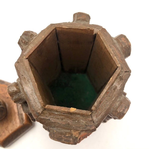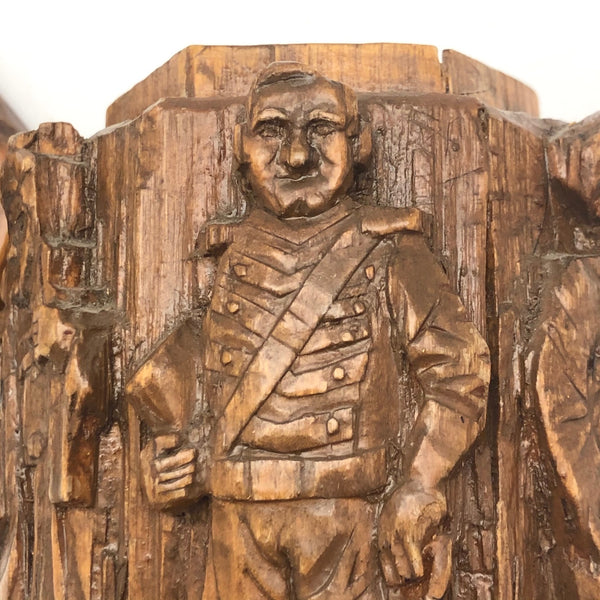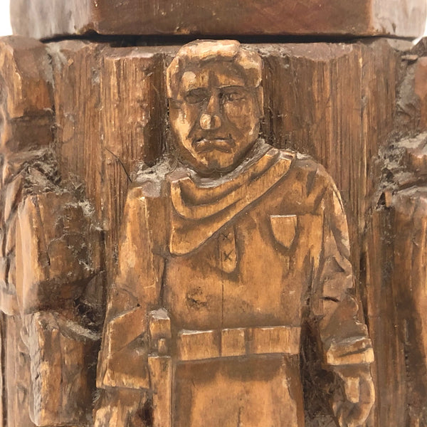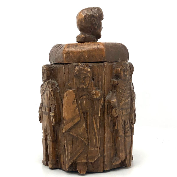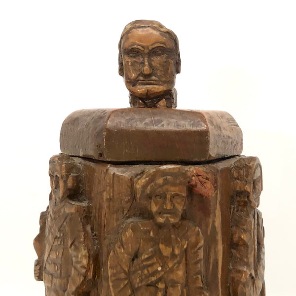 Totally wacky, but pretty fun, and whoever made this certainly had a vision which they exerted a lot of time and effort to carry all the way through. I might guess this vessel was made to hold tobacco, perhaps in a tin that fit inside? I'm not entirely certain the identities of the historic, international cast of characters carved in relief around the faceted perimeter, or the identity of the head on top, but I do believe George Washington and John Wayne are among them! Seems this might be a good jar for storing things one wants to be sure not to lose track of, as how could you forget putting something in this?!