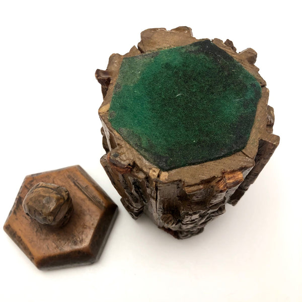 5 7/8" tall x 3 3/8" diameter. Constructed of six facets plus carved lid, which fits on in a few different positions. The bottom is simply green felt; perhaps there was once a wooden bottom piece but I'm not sure. Overall good condition, I would guess 1950s-1960s?